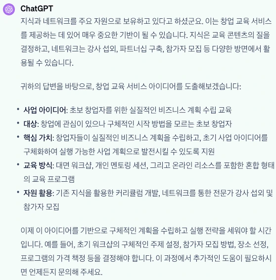 아래의 이미지는 챗GPT가 나와의 대화를 토대로 만들어준 '창업교육 서비스 아이디어' 다.