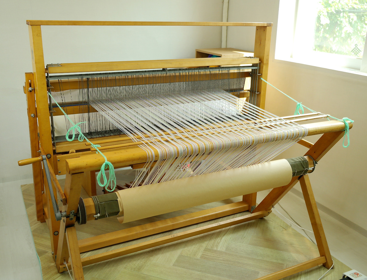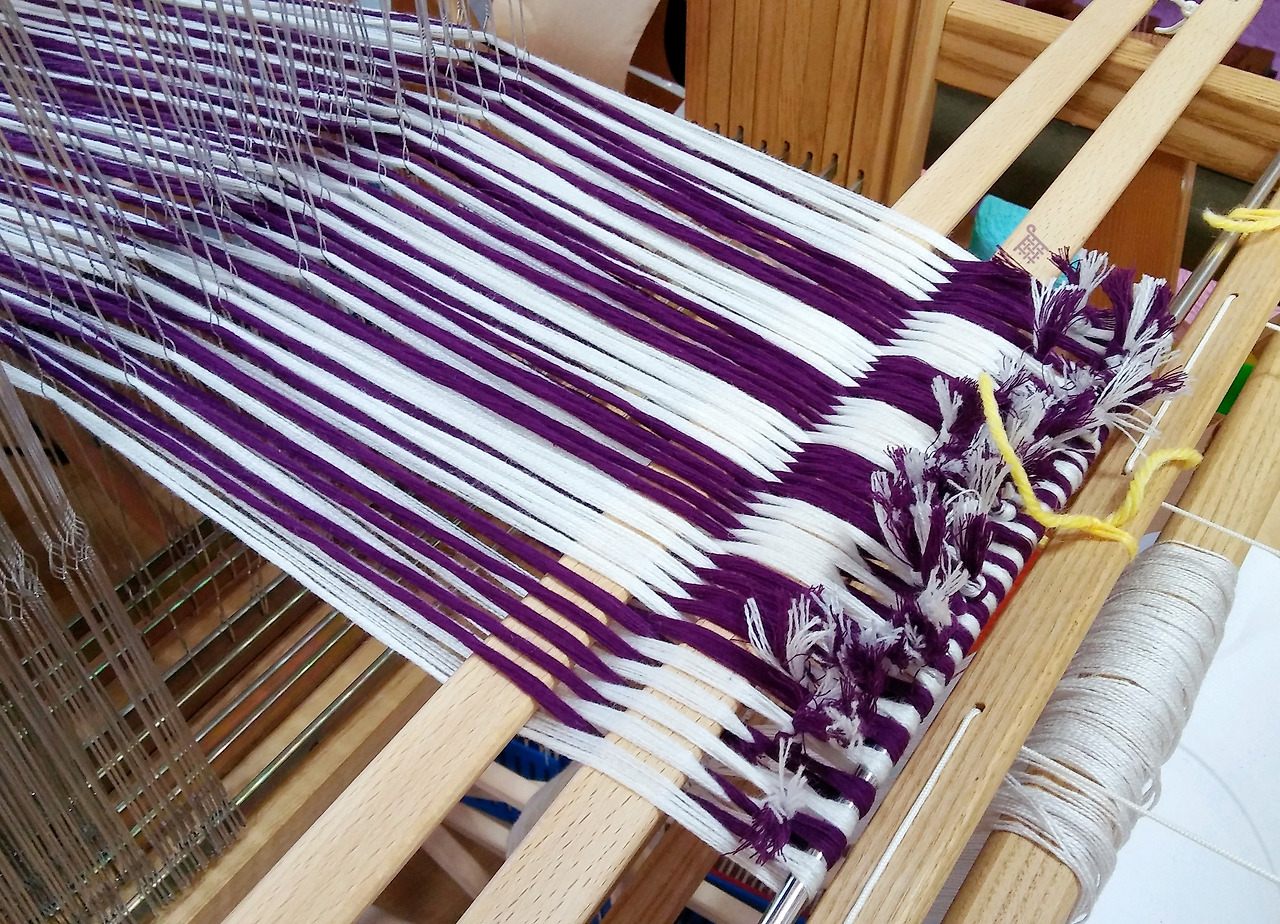 베틀의 앞쪽. 직물이 짜여지는 중이다. (왼) 베틀의 뒤쪽. 실이 걸려있다. (오)