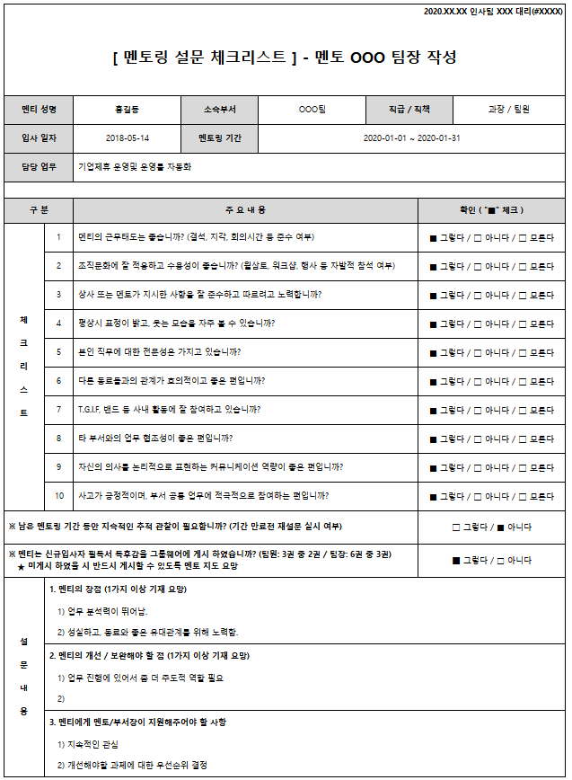 멘토의 멘토 체크리스트(평가서)는 시용 평가 기간인 입사 후 3월 중에 한번 작성을 하면 되었는데 이 평가서가 멘티의 시용 평가에 아주 높은 비중을 차지하게 된다. 사실 시용 평가의 경우, 멘토링 평가, 팀장 평가, 본부장 평가를 하고 최종적으로는 본부장이 시용기간을 종료할 것인지 말 것인지를 결정하는 평가의 가이드가 되었다. 물론 대부분의 인력이 시용 평가를 통과하게 되지만, 시용 평가와 멘토링 평가서는 잘못 채용된 인력을 최종적으로 거르는 역할을 하게 된다.