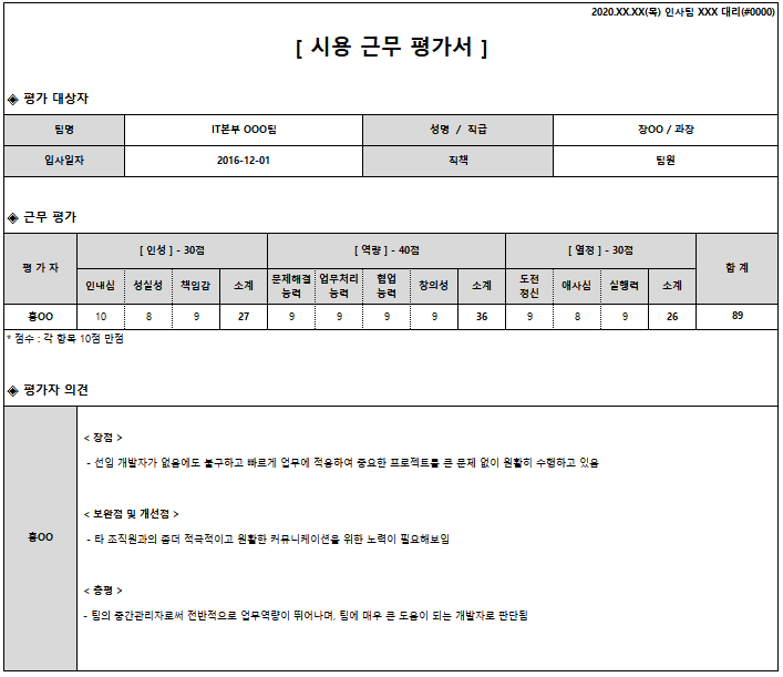 그리고 신규 입사자들이 회사에 적응을 잘하고 있는지 정말 우리와 함께 할 것인지를 위해 시용 평가를 운영했고, 이 시용 평가서에는 멘토의 멘토링 평가, 팀장과 본부장의 시용 평가서가 있었다.