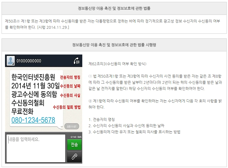 - 제50조(영리목적의 광고성 정보 전송 제한) ⑧ 제1항 또는 제3항에 따라 수신동의를 받은 자는 대통령령으로 정하는 바에 따라 정기적으로 광고성 정보 수신자의 수신동의 여부를 확인하여야 한다.