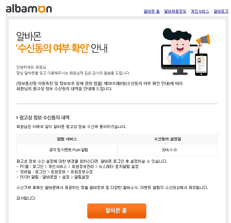 - 2014.11.29 이후 수신동의를 받은 경우에는, 수신동의를 받은 날로부터 2년 이내에 수신동의 여부 확인 안내를 해야함