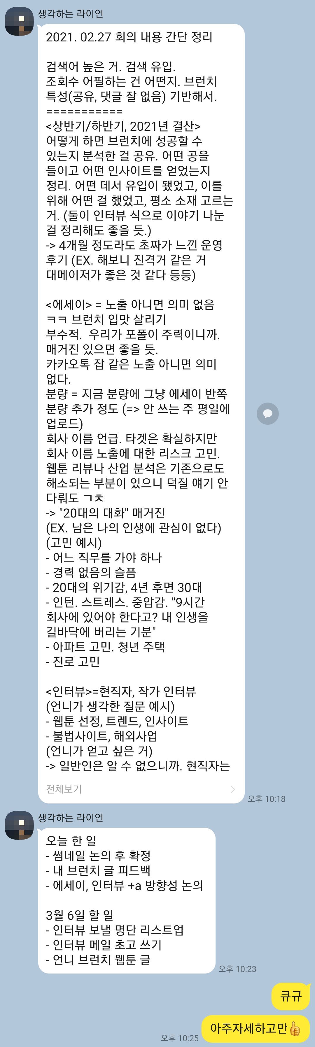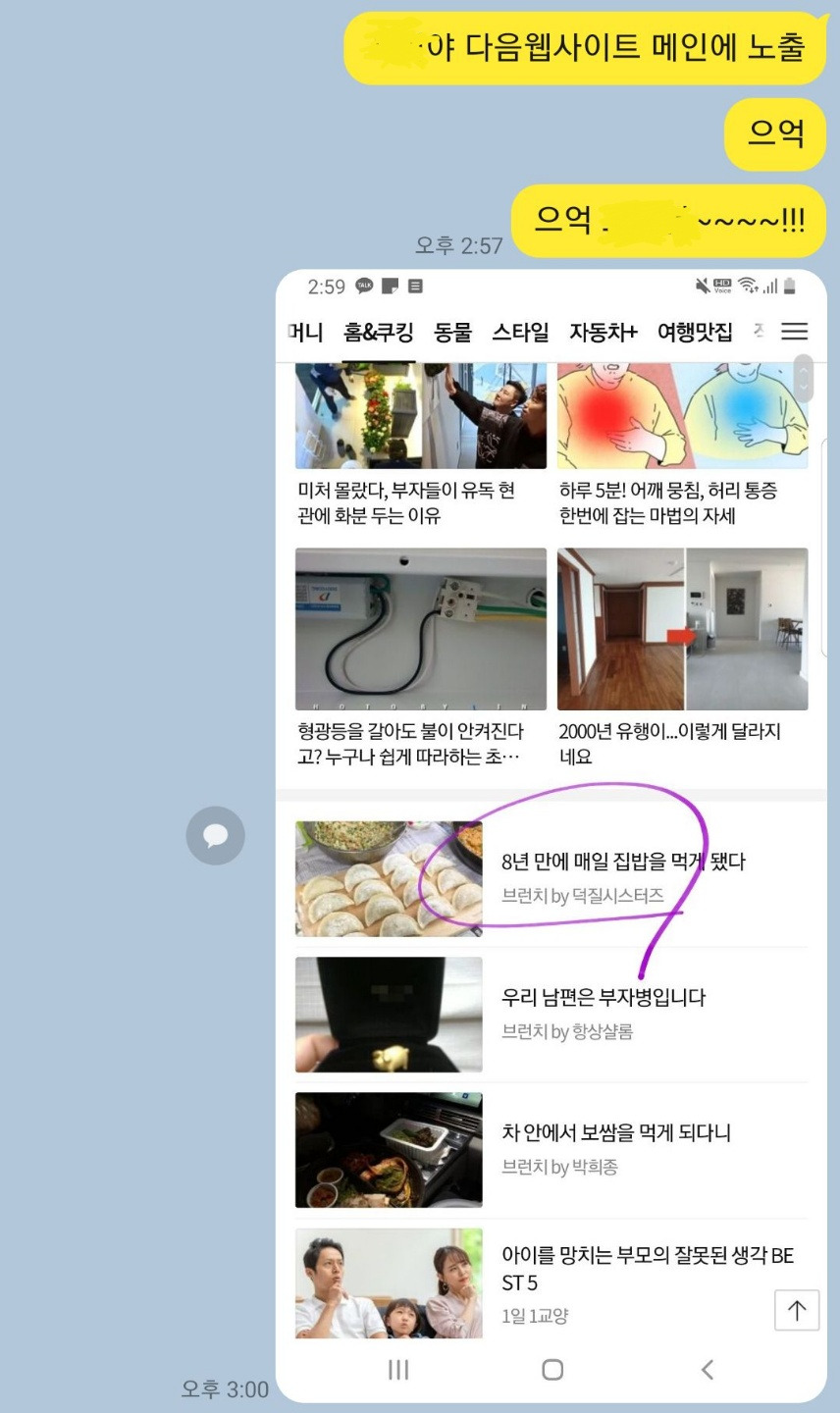 결론적으로 "에세이로 브런치 메인에 노출되자!"라는 목표를 잡고 3번 만에 카카오톡, 다음, 브런치 메인에 노출되는 것에 성공했다. 그러는 사이에 우리의 회의 시간은 두 배로 늘었다. 매주 에세이와 웹툰에 관한 글을 2건씩 발행했고, 브런치가 메인으로 보내는 글은 어떤 종류의 글인지 찾아보고 분석해나갔다.
