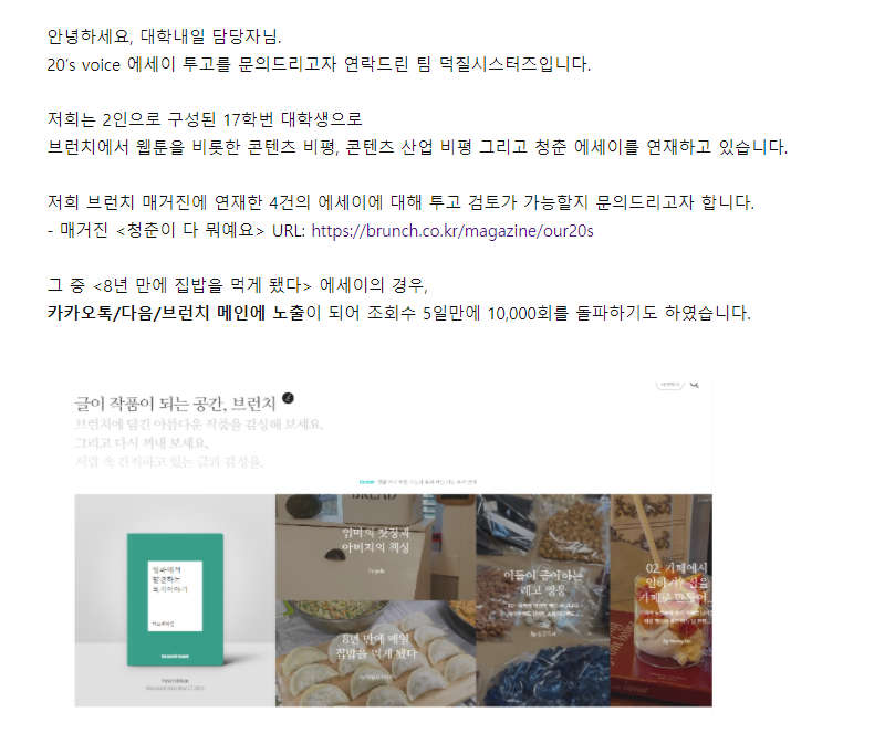 메인 노출이라는 소정의 목표를 달성하고 난 이후, 우리 둘은 이것저것 새로운 도전을 이어나가고 있다. 최근에는<브런치북 전자책 출판 프로젝트>를 준비했으며, 대학생 느낌의 에세이를 바탕으로 <대학 내일> 독자 투고도 시도했다. 아쉽게도 <대학 내일> 독자 투고는 더 이상 운영을 하지 않고 있다고 한다. 그렇지만 앞으로도 관심 있는 에세이 공모전, 웹툰 비평 공모전이 나온다면 꾸준히 도전해볼 생각이다.