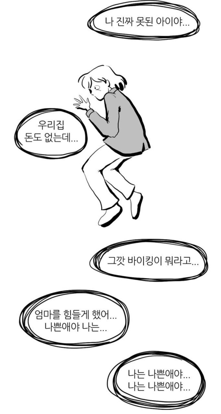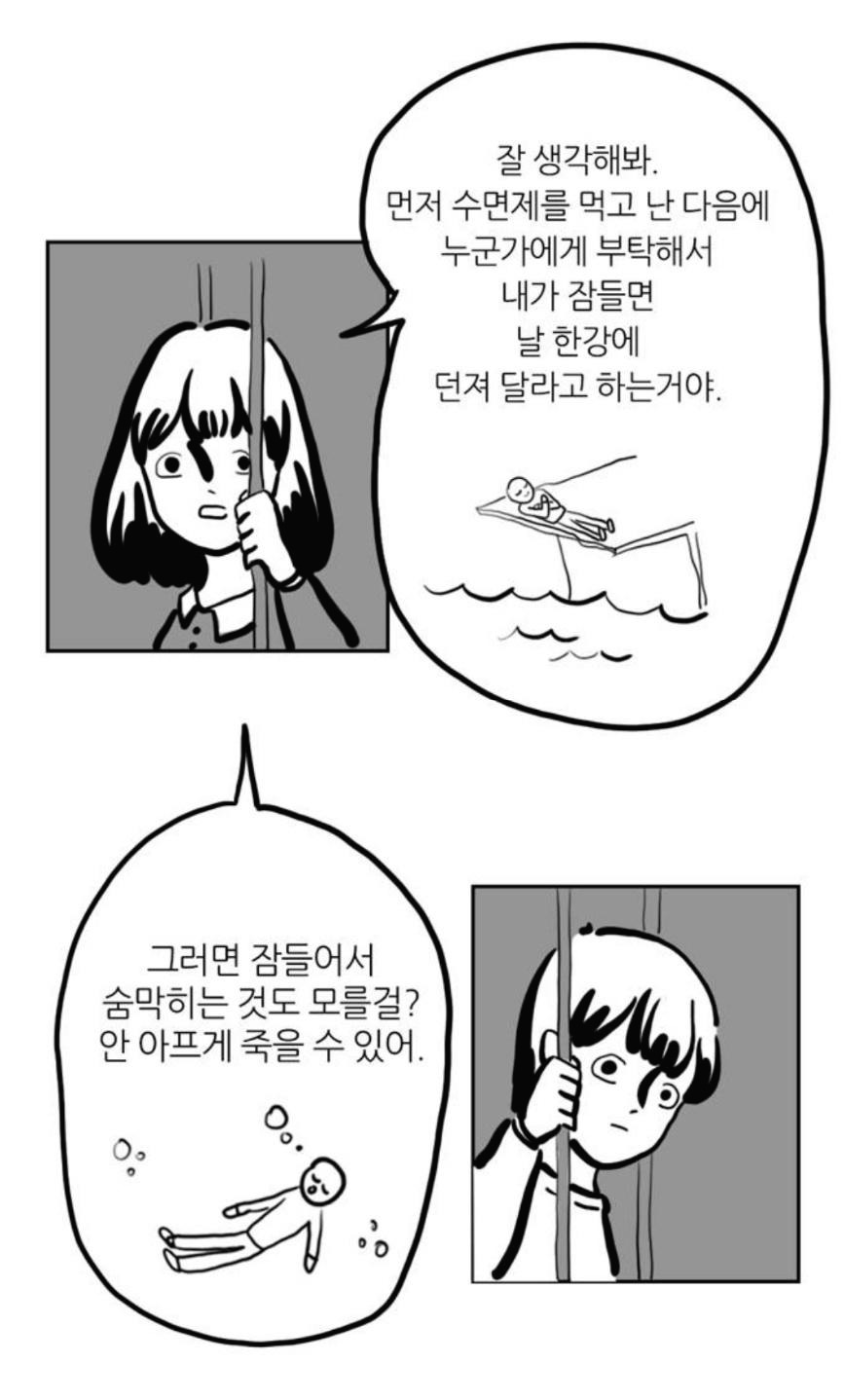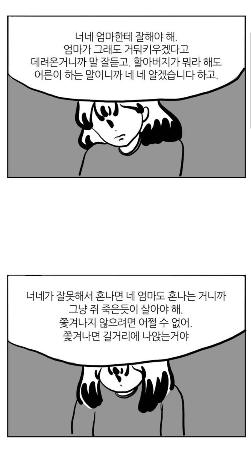 그리고 가정 폭력의 피해자들은 누구에게도 자신의 고통을 온전히 이해받을 수 없어서 외롭다. 백 번, 천 번을 설명해도 "집"이라는 공간에서 몇 년에 걸쳐 쌓인 당사자의 뒤엉킨 감정을 이해할 수 있는 사람은 이 세상에 없다. 뻥 뚫린 가슴을 삭이며 홀로 베갯잇을 적시던 수많은 밤도 오로지 자신만이 아는 순간들이다. 오직 나만이 감내해야 하는 나의 고통. 타인이 타인이라는 것을 이해하기까지 아마 아이들은 몇 번의 고배를 맛봐야 한다. 슬프게도 가정 폭력의 상처는 밑 빠진 독과 같아서 주변에서의 단발적인 위로와 관심으로는 결코 쉽게 해결되지 않는다. 스스로 이겨내야 한다는 걸 받아들이기까지는 아주 오랜 시간이 걸리고, 또 그렇게 되기까지는 아주 단단해져야 한다.