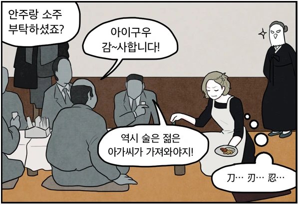 할아버지의 죽음은 즉시 '유복한 가정'의 구성원들을 위태롭게 연결하고 있던 고리를 끊어버린다. 결국 그 이후 완벽한 가족은 그 실체를 드러낸다. 주인공 최은성은 여자라는 이유로 자신을 아껴주던 할아버지의 죽음을 애도할 시간도 없이 음식과 술을 나른다. 죽음을 추모하는 자리에서 성희롱을 당하고, 그것을 참아내고 잠을 설쳐가며 손님을 맞는 것은 여성이다. 그에 비해 남성들은 처음 보는 망자 본인의 친족에게 성희롱을 하고, 술을 마시며 고인의 죽음에 대해 이야기를 나눈다. 여기서 나아가 싸움을 벌이기도 한다.