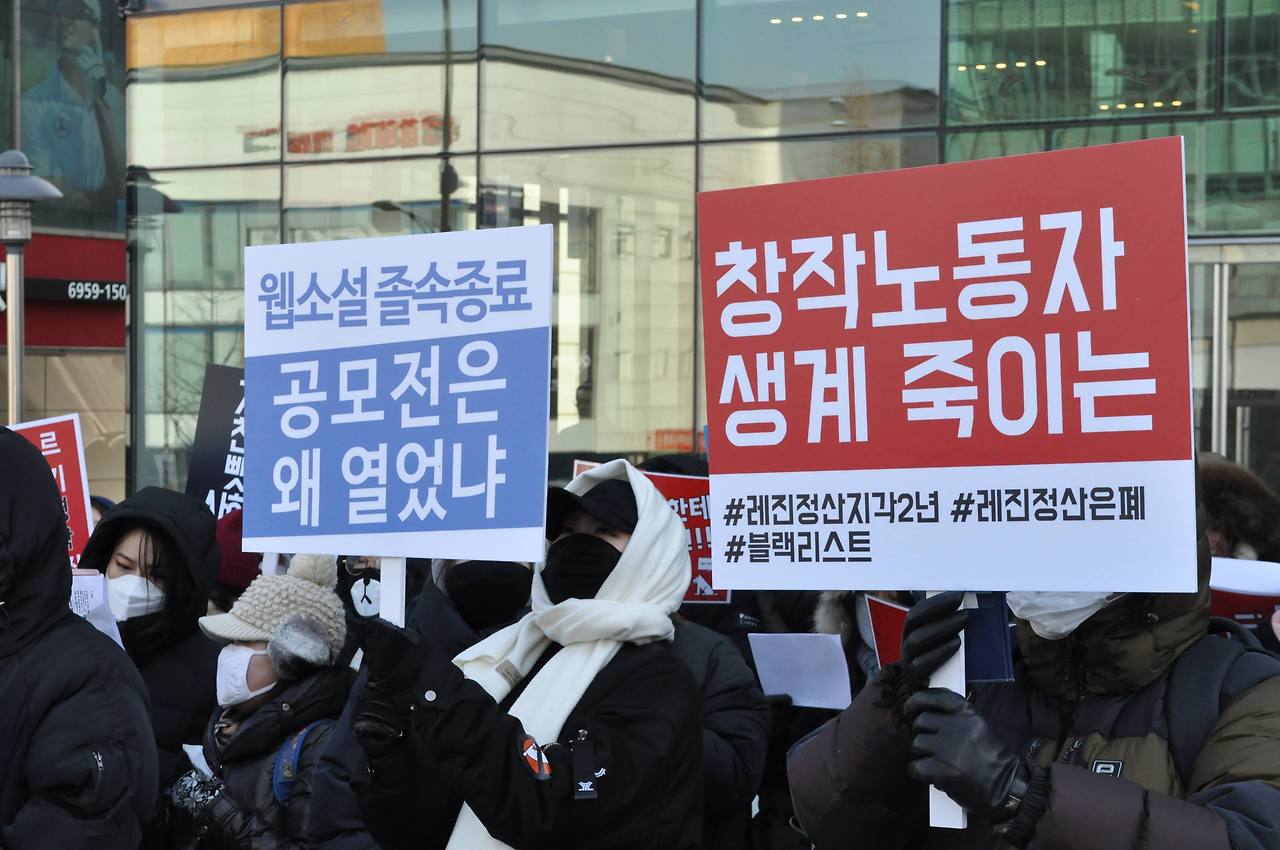 그만 쓰고 싶다. 레진코믹스 이야기. 작가들이 웹소설 작가를 간담회에 초대하지 않으면 시위하겠다 예고했고, 레진은 간담회 장소를 잡았으나 거부당했다. 그리고 장소를 핑계로 간담회를 연기했다. 하지만 그것이 함정카드였다. 작가들은 이런 사태에 대비해 미리 레진 사옥 앞에서 집회를 신고해 놓았고, 레진이 정말로 간담회를 연기하자 1월 11일, 레진 사옥 앞에서 집회를 진행했다. 작가, 독자를 비롯 약 150여명 정도의 인원이 모였다. SBS를 비롯해 허핑턴포스트 등 다양한 취재진도 눈에 띄었다.