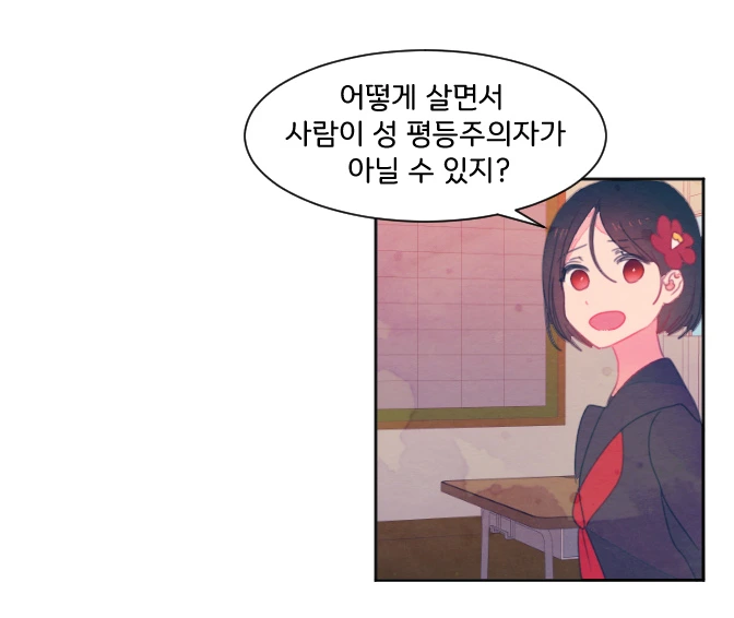 반면, 춘희는 머리에 항상 빨간 동백꽃을 꽂고 다니고, 성차별적 발언을 참고 넘어가지 않는다. 뿐만 아니라 공부도 잘하고, 인기도 많다. 한마디로 '보통이 아닌' 여성으로 그려진다. 취미도 '남들'이 보기엔 보통이 아니다. 겉보기에는 활기차고 평범한 아이처럼 그려지지만, 춘희는 자신에게 가해지는 폭력에 무기력하다. 때문에 세상에 많이 지친 상태다. 차별과 혐오는 일상에 만연하고, 개인으로 할 수 있는 일은 너무나 적기 때문이다. 한두번 벽에 부딫히다 보면 계속 도전하게 되지만, 가장 가까운 곳의 폭력도 어찌 할 수 없는 나를 발견하고 나면 깊은 무기력함에 빠지게 된다.