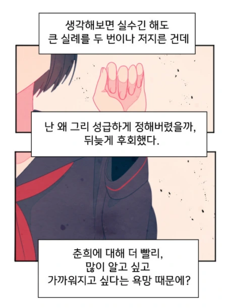 이 작품을 보면서, 이런 만화를 기다려왔다는 생각을 했다. 작품에 반복적으로 등장하는 말 중에는 '내가 태어나고 싶어서 태어난 것도 아닌데'라는 말이 있다. 주인공 춘희는 태어나던 시기에 마침 닥쳐온 경제위기로 시작된 가정폭력에 시달린다. 이 작품에서 다루고 있는 차별, 혐오, 폭력과 아픔은 나와, 너와, 우리 세대의 일이다. 나의 달력에는 친구들이 저마다의 이유로 선택한 삶의 마지막 날이 거의 월마다 기록되어 있다. 이 세상의 차별과 혐오, 폭력과 아픔은 뿌리깊게 박힌 저주와 같아서, 어쩌면 바꿀 수 없다고 생각하고 있었다. 이 작품은 그렇게 생각하는 사람들에게, 지금 현재를 살아가는 사람들에게 큰 위로를 전하는 작품이다. 물론, 그런다고 세상이 바뀐다는 보장은 어디에도 없다. 사람은 쉽게 바뀌지 않는다. 그럼에도 불구하고, 우리는 앞으로 나아가고 변화를 받아들이길 멈추지 않을 것이다. <하늘에 핀 동백꽃>이 고마운 이유다.