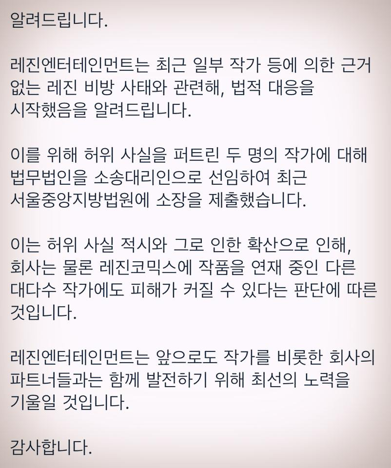 들리는 말에 의하면 해당 법무법인은 업계에서도 손꼽는 대형 법무법인이란다. 이게 끝이 아니라는 소문도 들린다. 길고 긴 소송전으로 사람을 지치게 만들고, 이를 통해 작가로서의 커리어를 끝내버리겠다는 의지가 엿보인다. 지난 10년이 넘는 시간 동안, 우리는 기업이 불공정을 고발한 사람들을 어떻게 괴롭히는지 지켜봐 왔다. 지난 1월 20일 만화가협회의 성명에서 "만화가협회 모두의 싸움"이라는 말을 보고도, 레진코믹스는 공정한 웹툰 생태계를 논하는 토론회 날에 보도자료를 배포했다. 누가 발언을 해도 당연히 레진의 사례가 등장하는 토론회 날, 기사에서 레진코믹스가 언급되는 것보다 자신들의 고소 기사가 먼저 나가기를 노린 것은 아닐까 추측해본다.