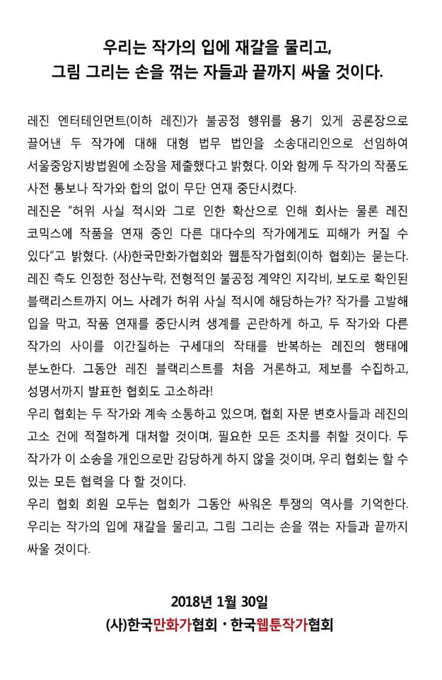당연히 모두가 분노했고, 작가들 뿐 아니라 평론가, 독자들까지 나서 #레진_나도_고소하라 해쉬태그 운동을 시작했다. 최전선에 선 작가들을 혼자 두지 않겠다는 연대 의사 표시였다. 작가들 사이에선 이미 피해 작가들과 연대하며 동맹 휴재를 선언한 작가들 외에도 추가로 휴재를 선언한 작가들이 나오기 시작했다. 이 뿐 아니다. 오후 11시가 조금 넘어서는 한국 만화가협회에서 성명을 발표했다. 너무 느리다는 비판을 받아왔던 협회지만, 아주 빠르고 강경한 대처를 보였다.