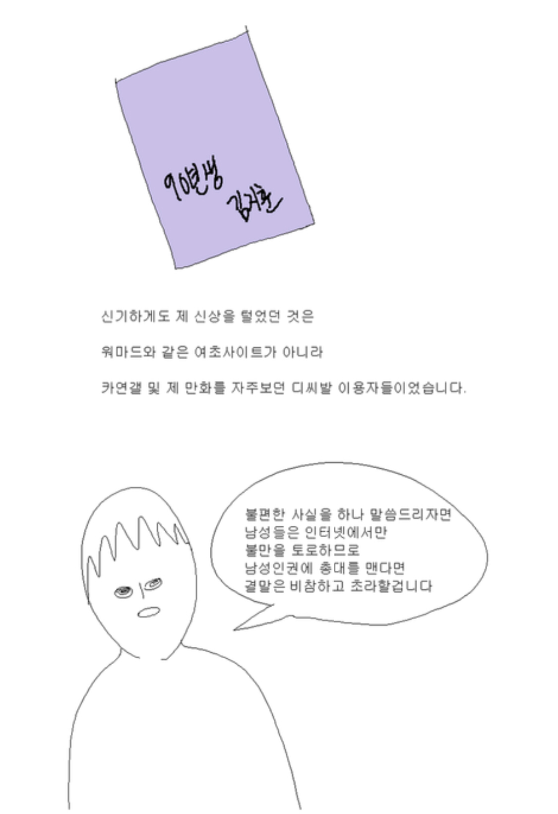 카광의 ‘실험’에 유의미한 결과가 있다면, 카광의 신상을 털고 카광에게 피해를 준/주려고 한 이들이 남초 커뮤니티였다는 점이다. 혐오는 그렇게 발휘된다. 폭력은 혐오를 기반으로 움직인다. 카광의 ‘실험’에는 이 부분이 빠져있다. 특정 의도를 가졌는지까지 판단할 수 없다. 다만, 이 실험은 틀렸다. 그 결과까지도.