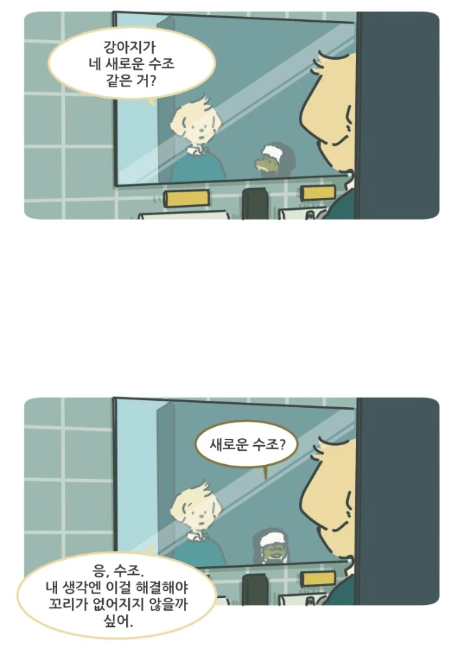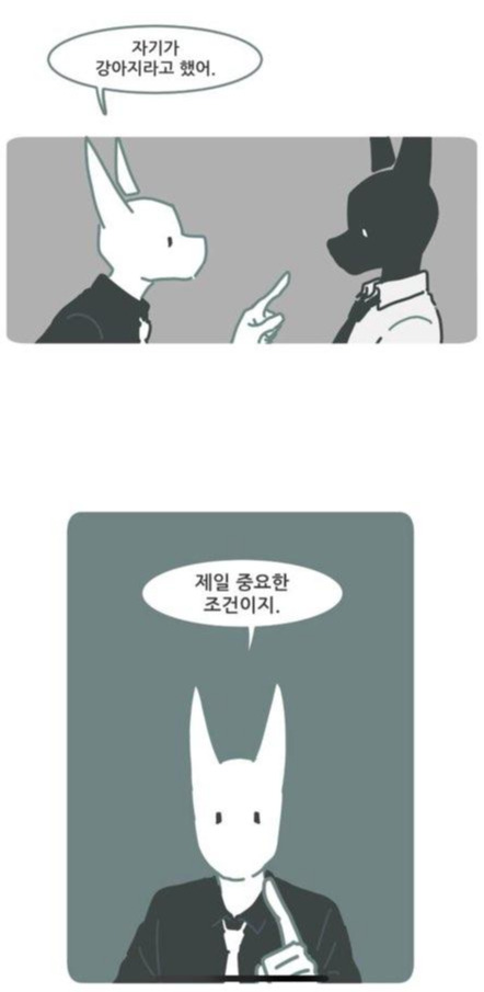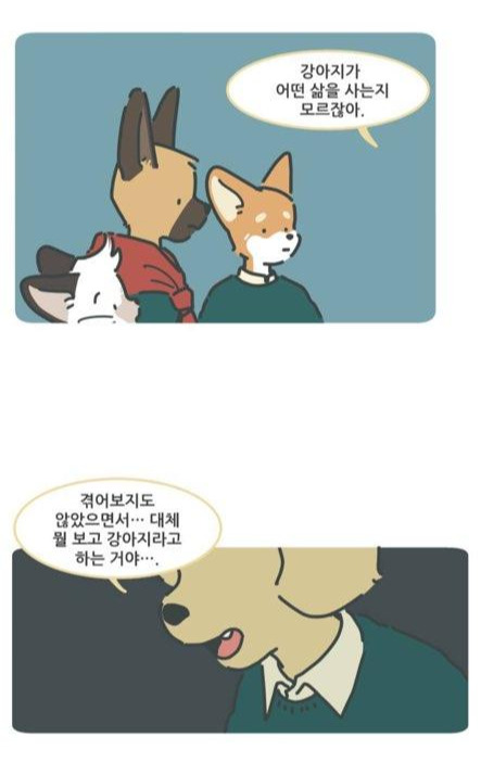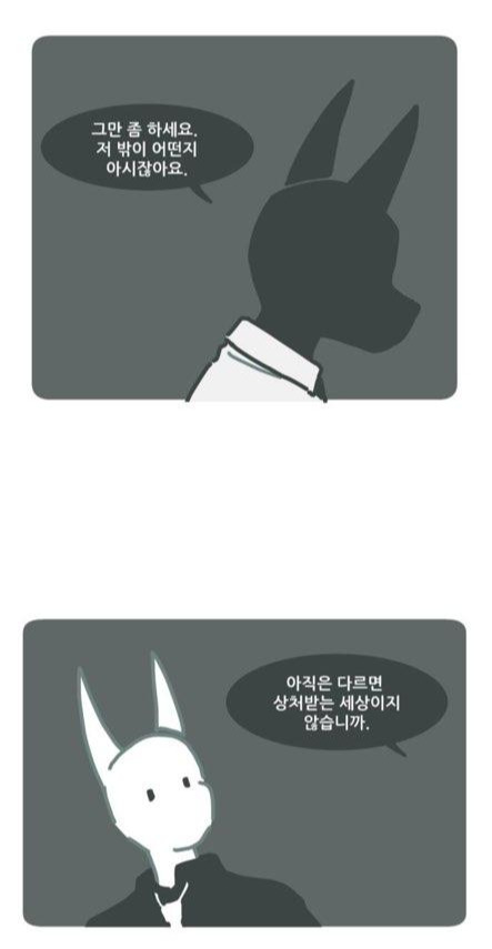 바로 관점의 차이가 여기서 드러난다. 흰 개의 입장은 '본인이 정했다면 우리가 해줄 것은 인정해주는 것'이라는 입장이고, 검은 개의 입장은 '상처받을 본인을 위해 존재를 지우도록 해야한다'는 것이다. 다른 소수자를 대입해도 마찬가지다. 우리에게 필요한건 그들을 '인정'하거나 '응원'해주는 것이 아니라 그들이 정한 대로 살 수 있는 세상을 만들려는 노력이다. 인간은 변화에는 빠른 적응을 보일지 몰라도, 다름을 인정하기는 어려워한다. 검은 개의 말 속에는 그런 인간의 모습이 담겨있다.