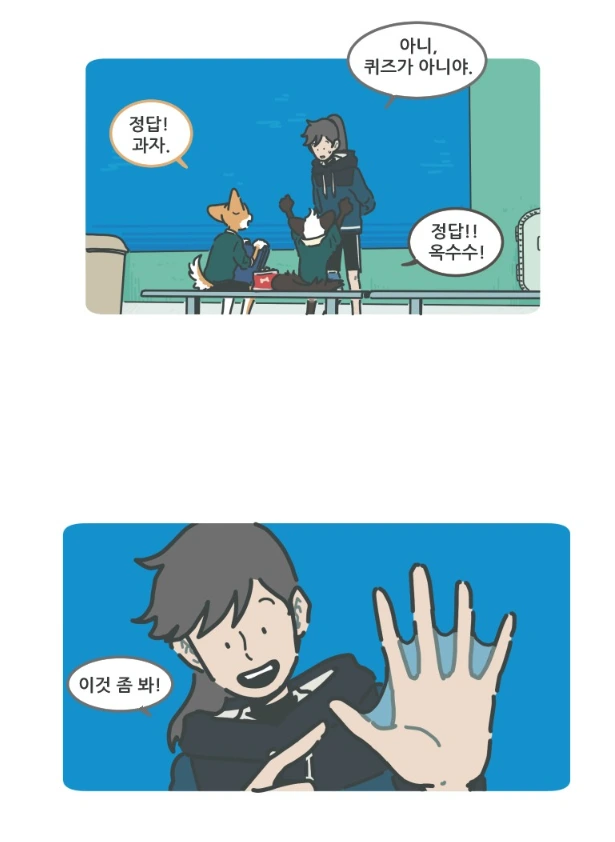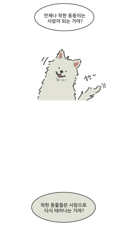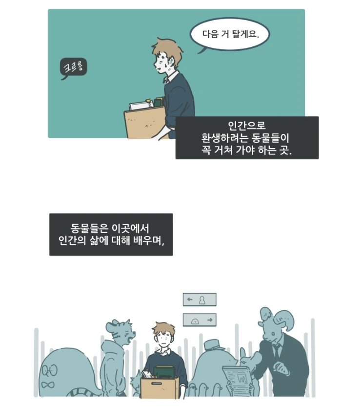 엘렌심 작가가 네이버에서 연재중인 <환생동물학교>는 이런 인간중심 사고에서 벗어나 가치중립적으로 환생을 바라본다. 사람도, 동물도 모두 환생이 가능한 대상일 뿐, 일단 환생의 대상이 되면 종은 크게 중요하지 않은 것으로 보인다. 물론, 환생의 대상으로 적합해야 한다는 조건은 있지만, 이건 인간으로 환생하는 존재들에게 주어지는 '보상'이 아니다.