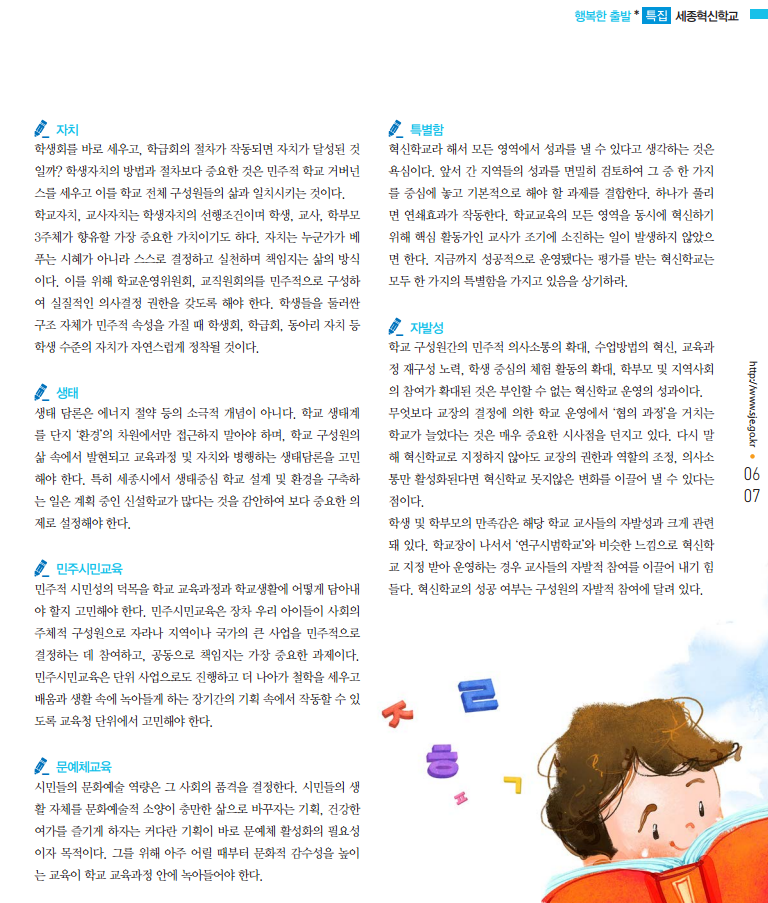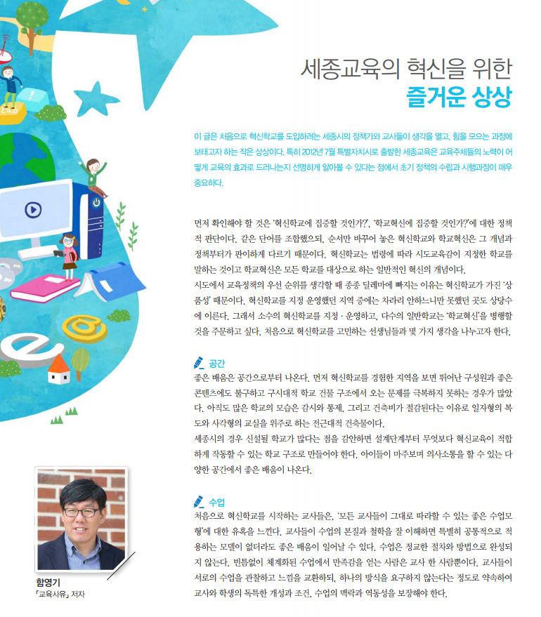 특별자치시로 출발한 세종시는 2012년부터 2014년까지 23곳의 유치원과 초중고등학교를 새로 지었다. 앞으로 2015년부터 2017년까지 29곳을 더 새로 짓는다고 한다. 이 과정은 우리 교육사에 없었던 거대한 교육실험이요, 교육혁신의 장정이다. 아울러 정부기관이 들어서면서 공무원의 자녀와 지역의 토박이들이 함께 섞일 때 나타나는 독특한 교육상황을 고려해야 하는 곳이기도 하다. 모든 것을 처음으로 시작하는 세종교육은 교육주체들의 노력이 어떻게 교육의 효과로 드러나는지 선명하게 알아볼 수 있다는 점에서 초기 정책의 수립과 시행과정이 매우 중요하다.