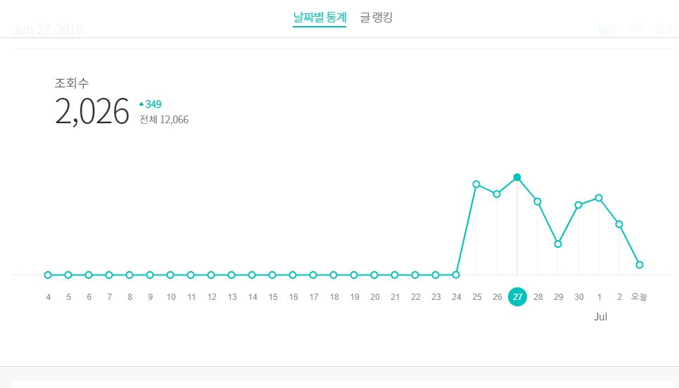 최다 조회 발생일: 6월 27일(2,026건) 유입경로 최다: 페이스북, 카카오톡, 다음, 브런치 순