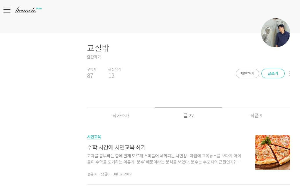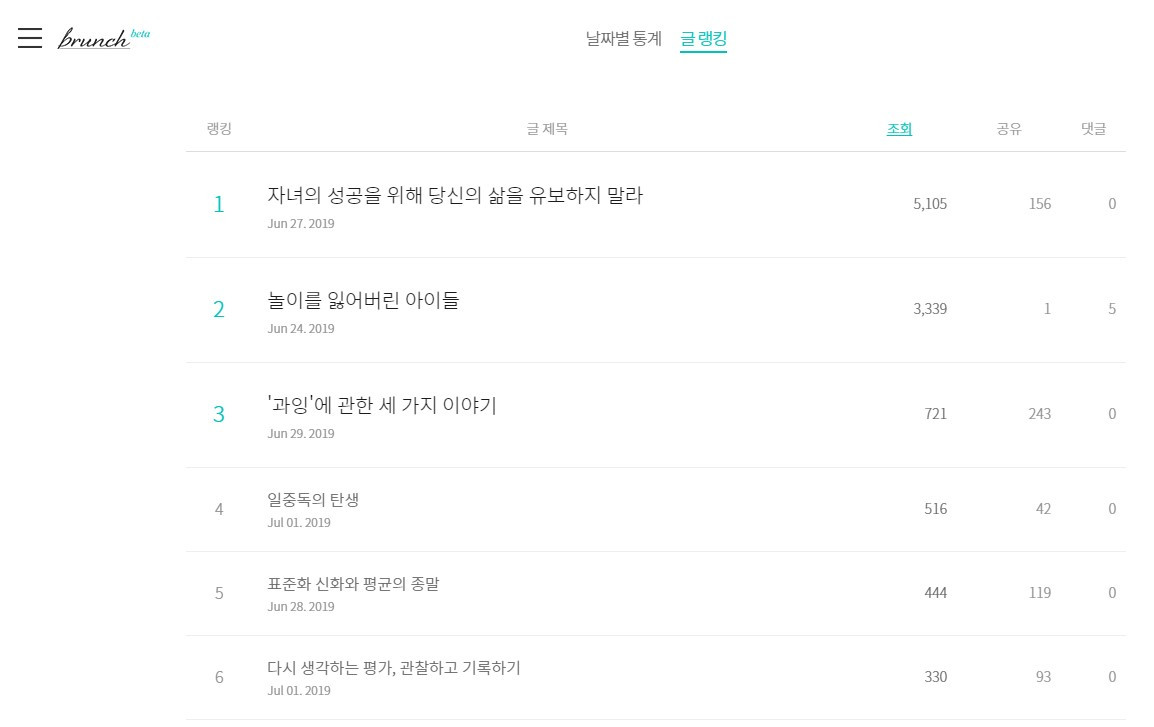 거칠게 비교를 하고 보니 페이스북과 브런치는 상호보완적이다. 그리고 어디서든 '기존 SNS 영향력'이 강하게 작용한다. 이는 양쪽 다 작가 지망생 입장에서는 진입장벽이 높음을 의미한다. 내 경우에도 실험을 해보니 브런치 자체에서 발생하는 노출보다 SNS에 소개했을 때 생기는 유입이 훨씬 많았다. 더 글을 쉽고 편하게 쓰는 플랫폼도 생겨야 하겠지만, 한편으로 글을 쓰고자 하는 사람들은 최소한의 글쓰기 공부가 뒤따라야 함을 방증하는 측면이다. 6월 25일 작가 등록이 승인됐는데 그 이후 조회수 늘었다. 6월 27일 가장 많이 읽었는데 '자녀의 성공을 위해 당신의 삶을 유보하지 말라'는 글을 올렸을 때다. 브런치 독자들이 자녀교육에 대한 관심이 많은 것을 확인할 수 있다. 그러나 매거진 이름은 자녀교육이 아닌 '부모교육'으로 했다. 내가 그들의 자녀를 직접 만날 수는 없으니 개념상 부모교육이 맞다. 처음에 '부모교육학'으로 했으나 매거진 이름을 모두 네 글자로 통일하자는 마음에 부모교육으로 했다.