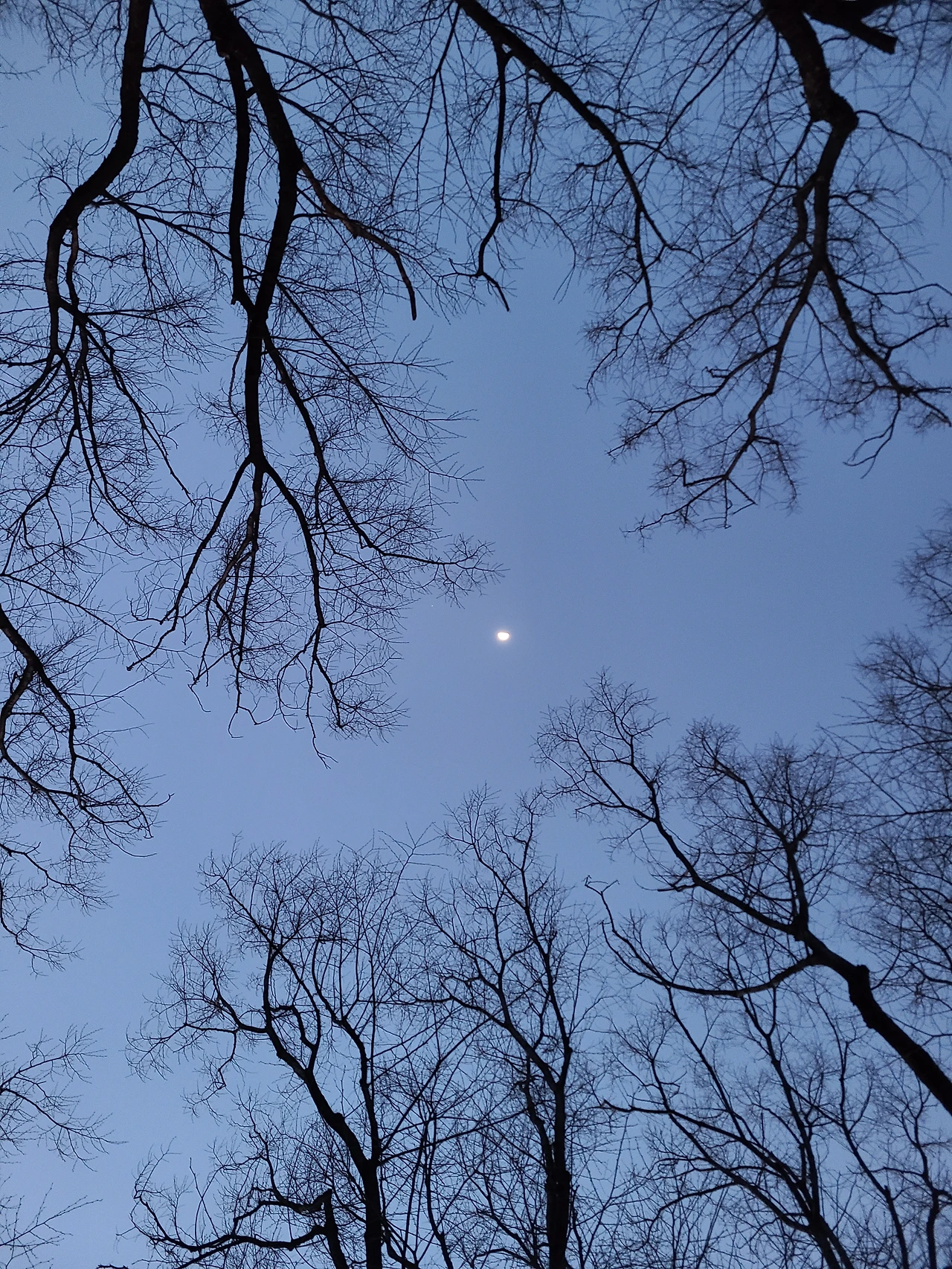 주말에 절두산 성지를 둘러보다 나무의 잔가지 사이로 모습을 드러낸 달을 보았다.