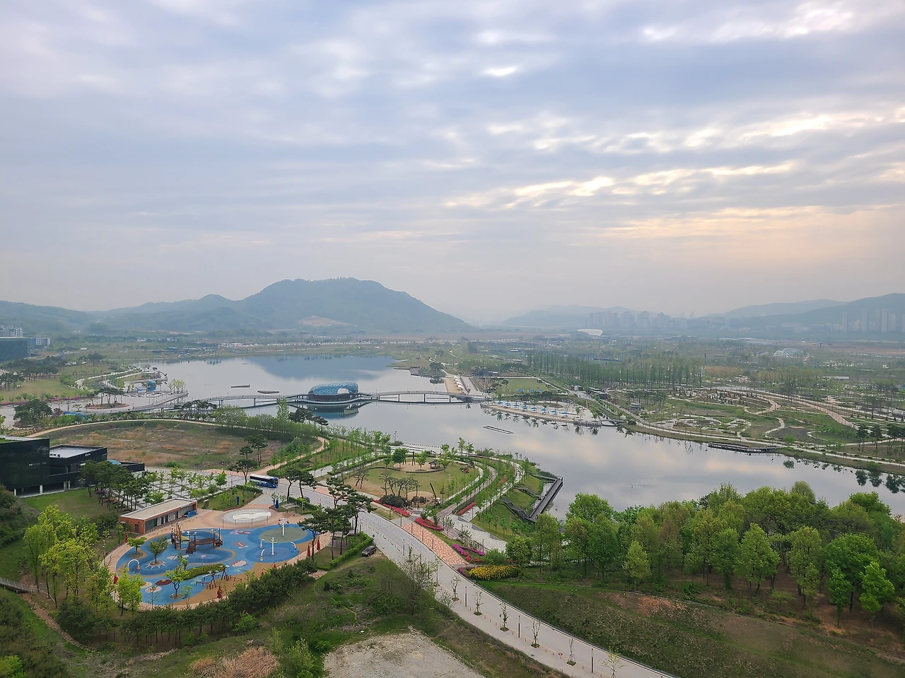 잔잔한 호수와 낮은 산, 내려 앉은 구름까지