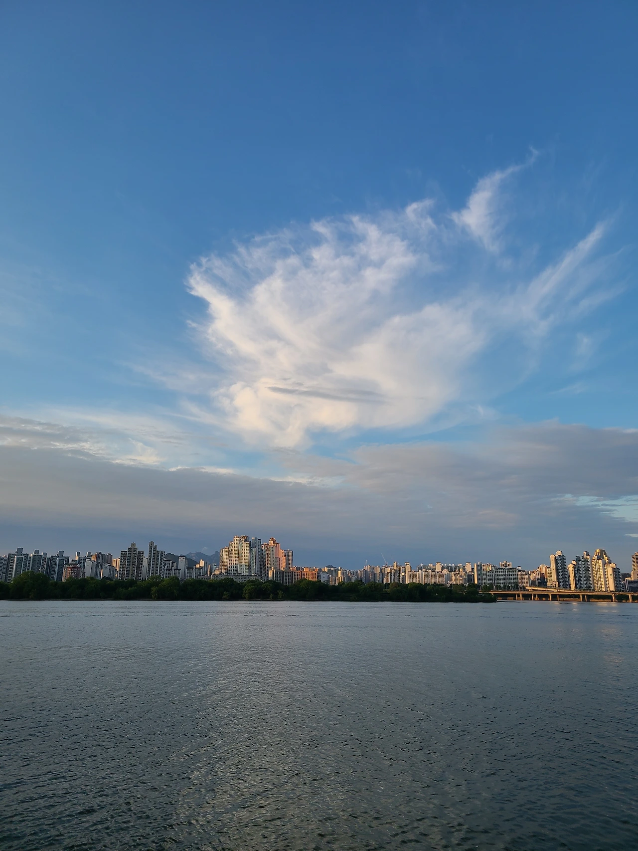 예정보다 일찍 회의가 끝났다.난 회의였다. 바쁜 업무 사이클이 갑자기 멈추니 긴장이 풀리면서 공허감이 밀려왔다. 그래서 홀로 찾은 한강변. 무심하게 흐르는 강물은 말이 없고, 하늘에 떠 있는 구름은 대체로 평온하다. 한동안 강물을 응시하다가 발길을 돌렸다.