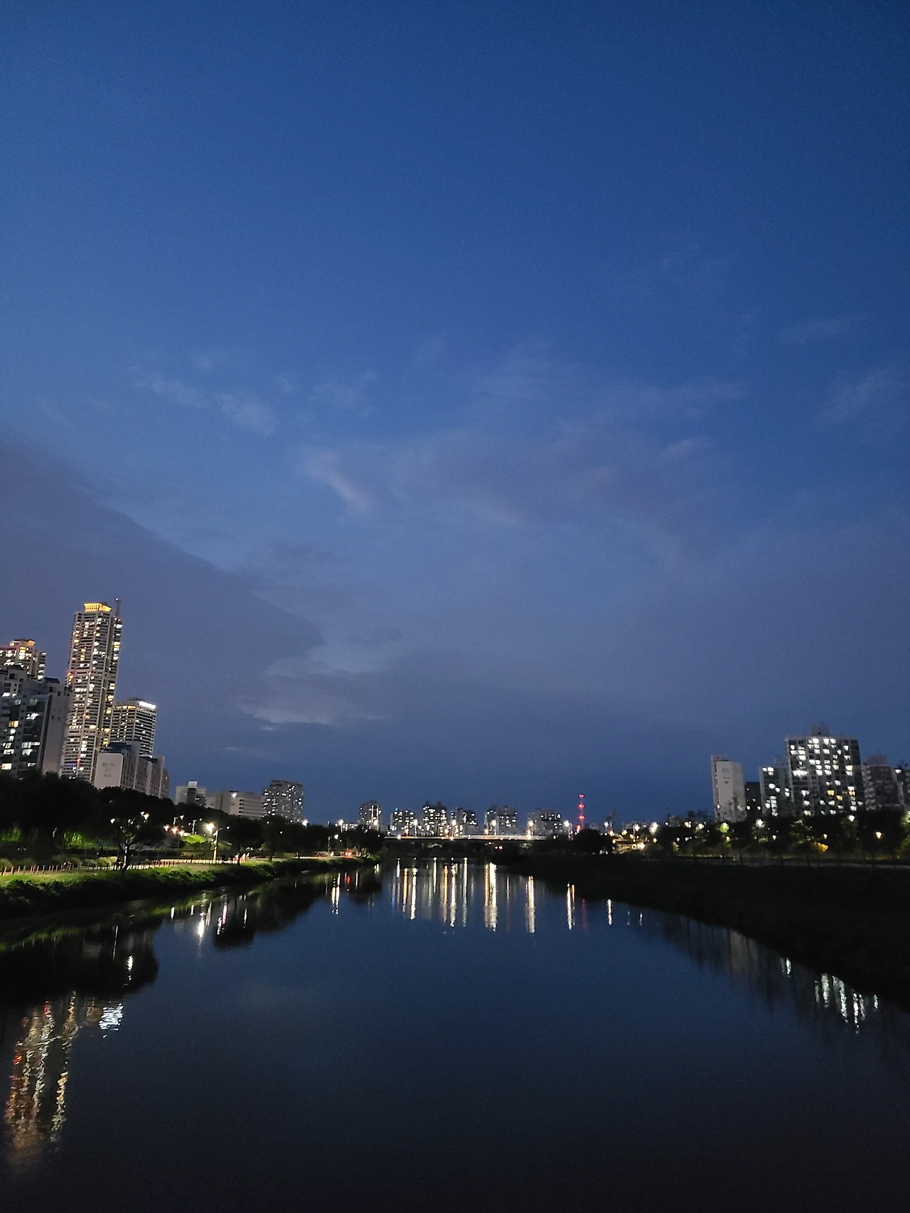 연휴 이틀째다. 저녁 산책 중이다. 강변은 고요하고 하늘은 푸르다.
