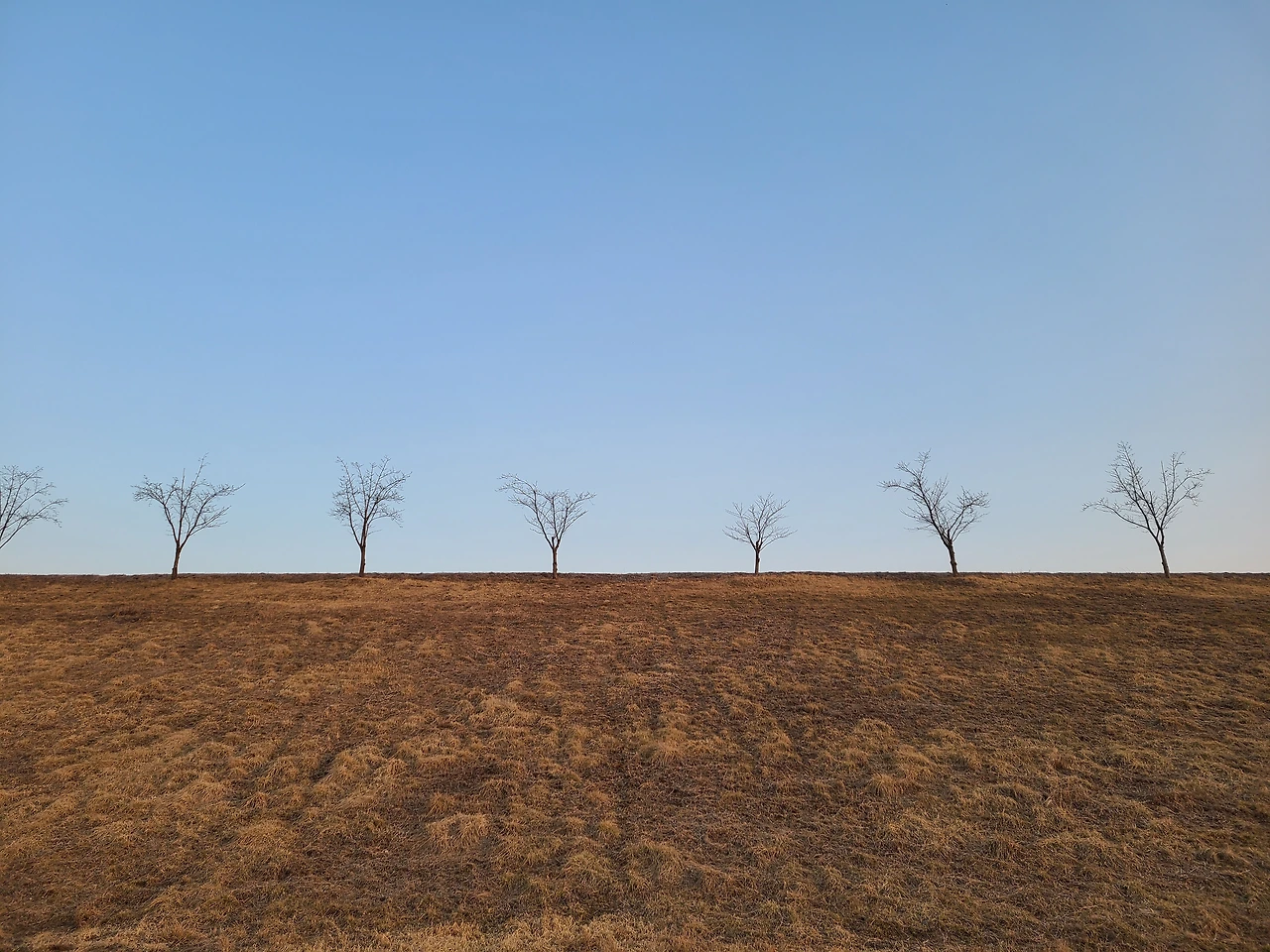 사람없는 곳에서 조용하게 걸었다. 시간이 흐르고 계절이 바뀌면 뭔가 신나는 일이 있을까. 뚝방 위 작은 나무들이 겸손하게 줄을 섰다.