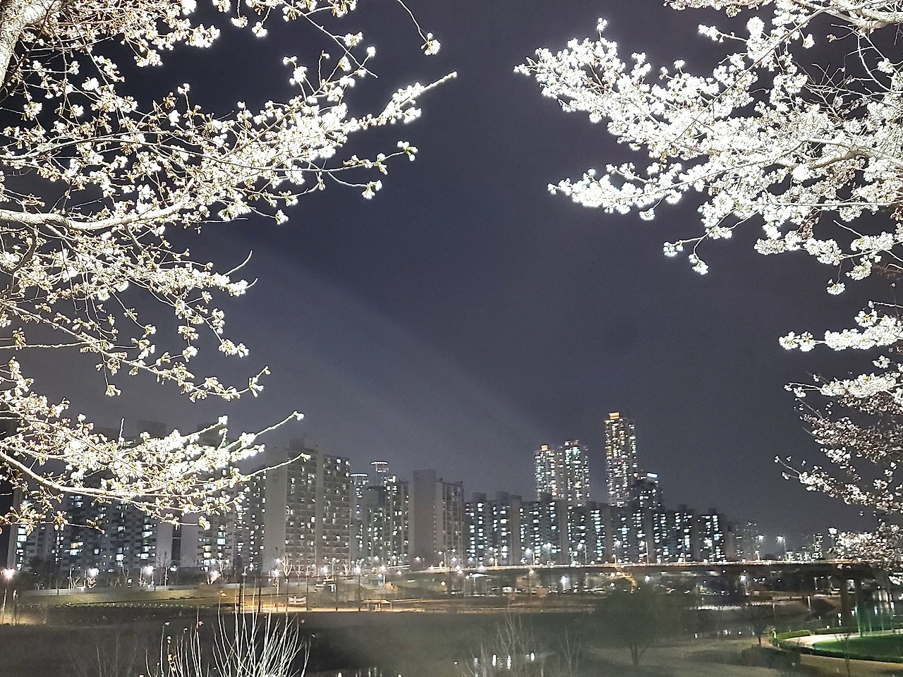 퇴근 후 강변으로 나갔다. 예년보다 일찍 만개한 벚꽃을 보았다. 강 건너 높다란 건물과 밤 벚꽃이 묘한 조화를 이뤘다.