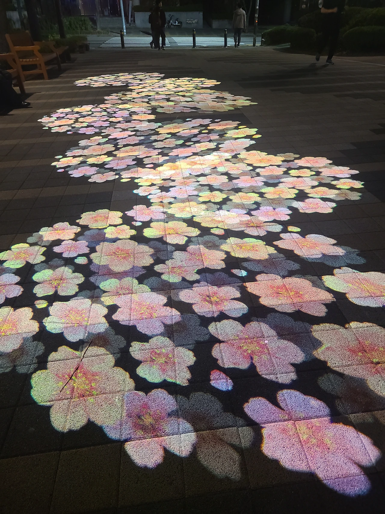 금요일 퇴근 후, 피로가 몰려오는 시간이다. 이번 주말엔 집에서 처리해야 할 일거리를 잔뜩 가져왔다. 그 자체가 부담이다. 처리 여부를 떠나 주말에 충분히 쉬지 못하면 새로운 한 주가 힘들어지기 때문이다. 늘어지지 않으려고 무거운 몸을 이끌고 밤마실을 나왔다. 요즘 동네마다 LCD 프로젝터를 매달아 홍보나 캠페인을 하던데, 내가 본 것은 만개한 꽃을 바닥에 비춘 것이다. 그래, 쉬는데 무슨 구호가 필요할까. 잠깐 멈추어 화려한 길바닥을 감상한다.