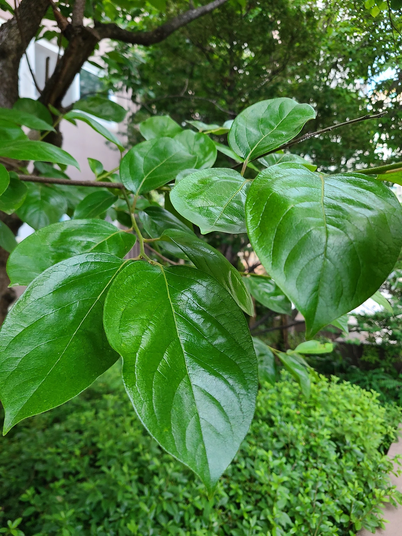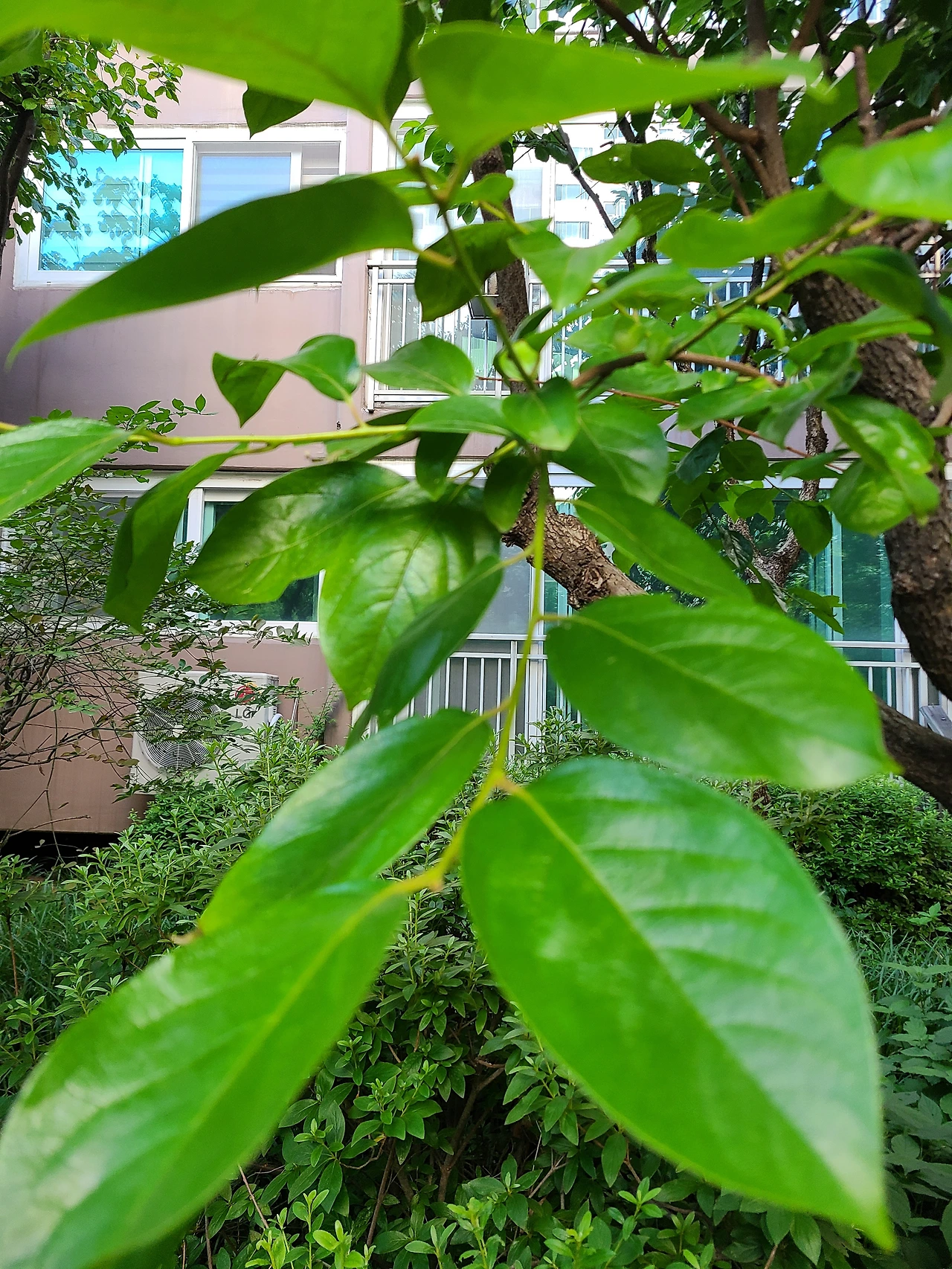 꽃보다 이파리를 좋아한다고 말한 바 있다. 이파리 중에서도 목련의 이파리를 좋아하는데 모나지 않고 둥글둥글한 모양 때문이다. 오늘은 감나무 이파리를 소개하겠다. 이파리가 약간 두껍고 표면에 빛이 나며 기름지다. 잎맥이 선명하고 전반적으로 자신감이 넘치는 자태이다. 매끈하게 빛이 나는 것으로는 사철나무, 대추나무 등의 잎이 있지만 그중 감나무 이파리가 크고, 색으로 말하자면 한 여름엔 푸르다 못해 검푸른 색이 날 정도이다.