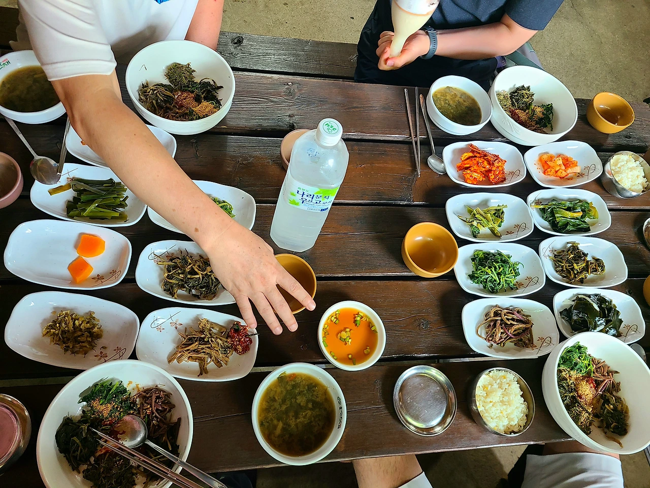 각종 나물과 함께 하는 점심 상, 가운데 있는 것은 나리분지 우산고로쇠물