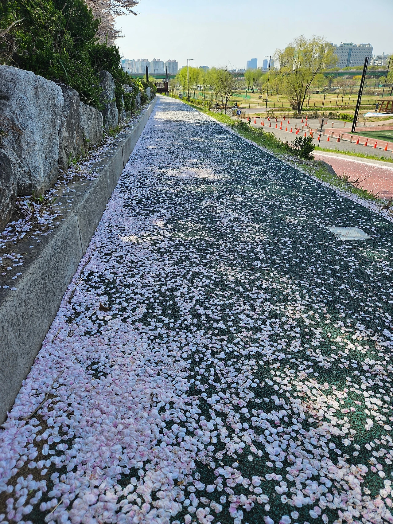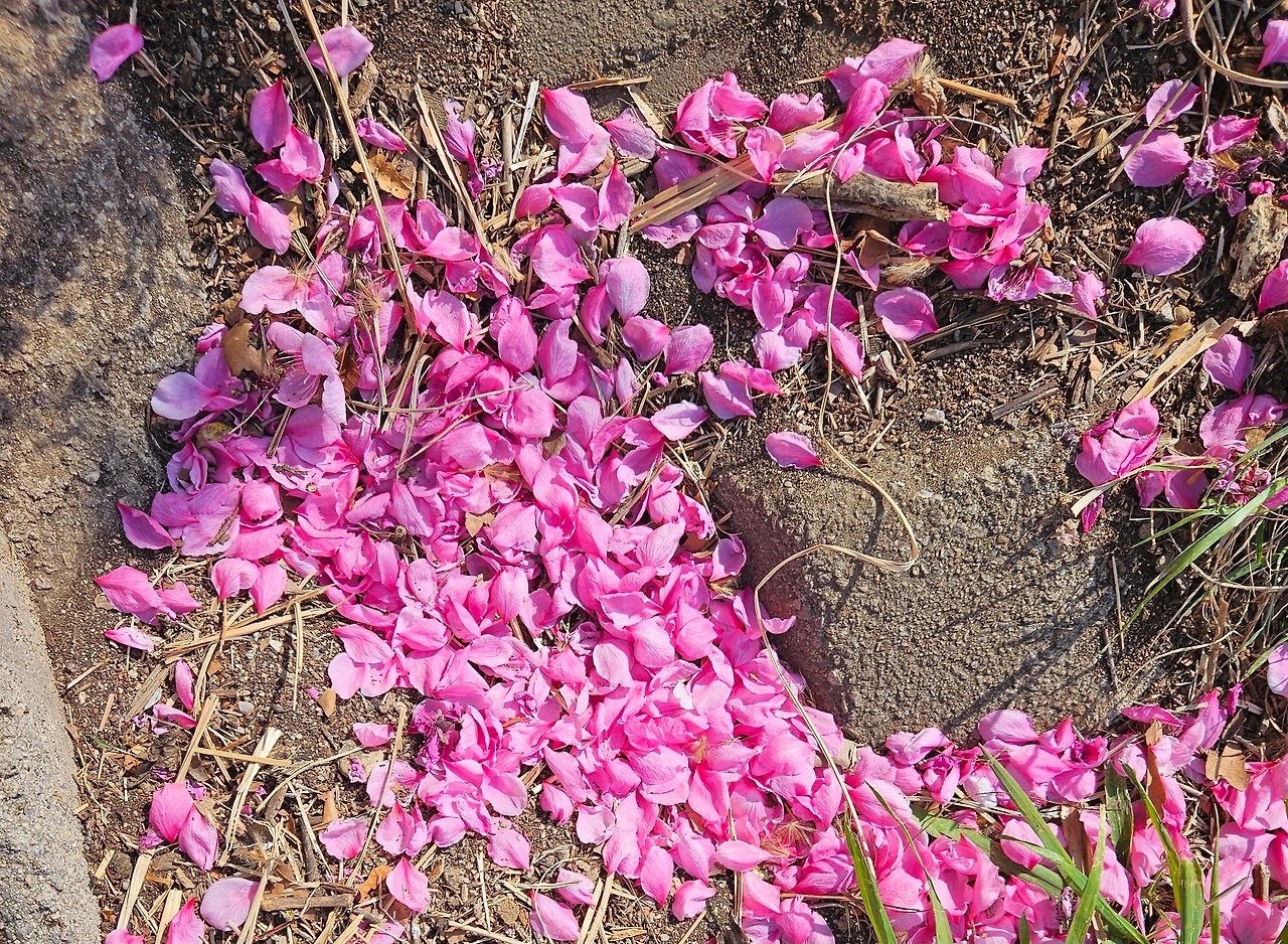 시인은 떨어지는 꽃잎을 보며 '결별이 이룩하는 축복'을 말했다. 화무십일홍이라 했다. 그 어떤 영광도 한철에 불과하다는 말이렸다. 거의 매일 강변을 걷다 보니 만나는 풍경이 있다. 흐드러지게 핀 봄꽃도 보았고, 제 시간을 다해 떨어져 뒹구는 '분분한 낙화'도 보았다. 시인은 봄 한철이라 말했지만 봄 꽃은 한꺼번에 시위하듯 떨어진다. 시인의 감성을 갖지 못한 내가 허무감을 느낄 사이도 없이 말이다. 벚꽃이 그렇고 목련이 그렇고, 복사꽃이 그렇다. 딱히 맞는 감정을 찾는다면 허무함보다는 당황스러움일지도 모르겠다. '격정을 인내한 나의 사랑'은 내게 너무 멀다. 그저 '이거 뭐야?'라는 당황스러움이 딱 내 수준이랄까.