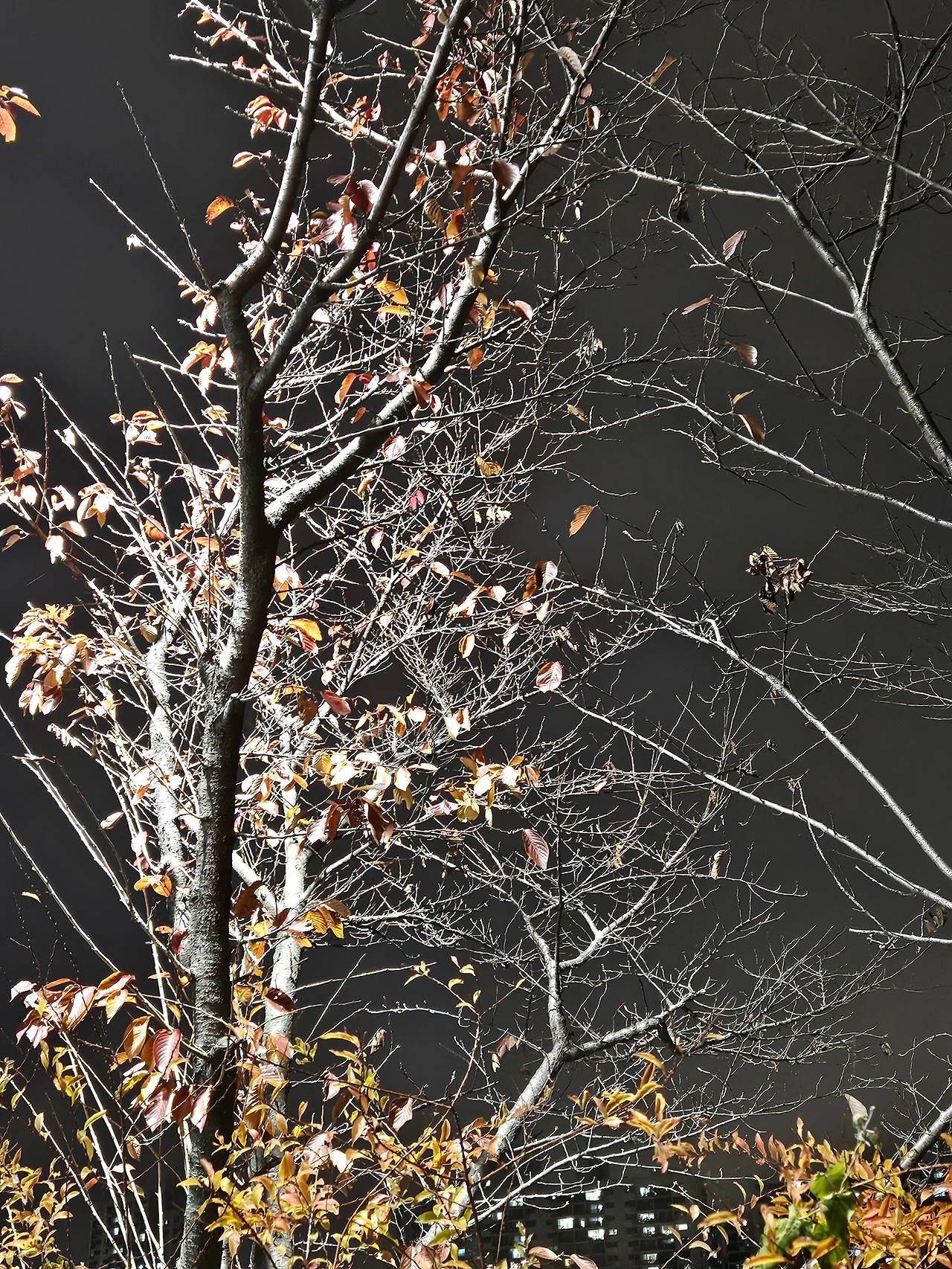 눈이 그치고 나무들은 잎을 떨구었다. 더 쓸쓸해 보이는 밤 풍경. 롱패딩을 입고 휘적휘적 걷다 들어옴. 겨울이 왔구나.