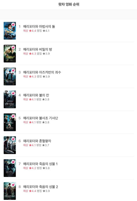 그 결과 , 12월 1일 왓챠의 영화 순위 1~8위는 해리포터 시리즈 전편이 차지했다. 작품이 개봉된 순서대로 1~8위를 차지했다는 것이, 이용자들이 해리포터 시리즈를 첫 편부터 정주행하고 있음을 보여준다.