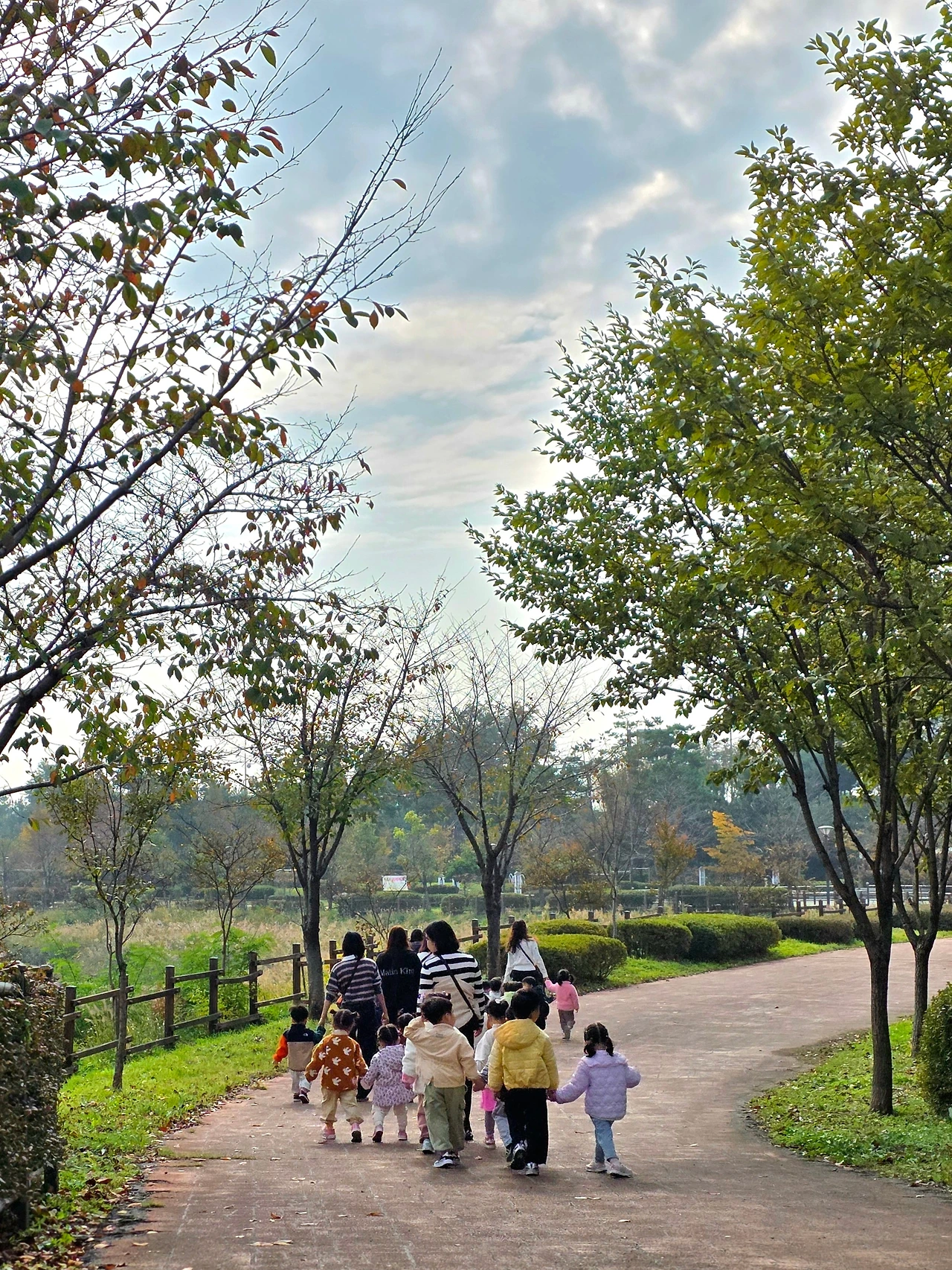 내가 사는 아파트 단지 안의 어린이집 아이들이라는 것을 알 수 있었다. 매번 단지 안에만 산책하다 중앙의 잔디마당에서 머물곤 했다. 그 안에서 걷고 뛰고 앉고 사진 찍고. 매번 그런 시간을 보내다 오늘은 선생님들이 용기를 내었을 것이다. 아이들과 함께 두 번의 횡단보도를 건너 공원까지 올 용기를.