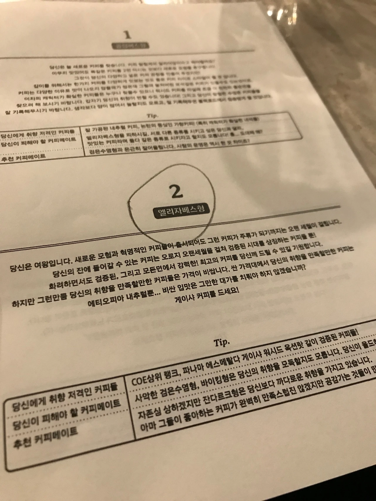내 앞에 주어진 작은 세 잔의 커피를 마셔보고 취향 순서대로 재 나열했다. 커피 탐험 안내자 타잔은 내가 배열한 순서를 보고 나의 커피 취향을 알려주었다. 엘리자베스 형.