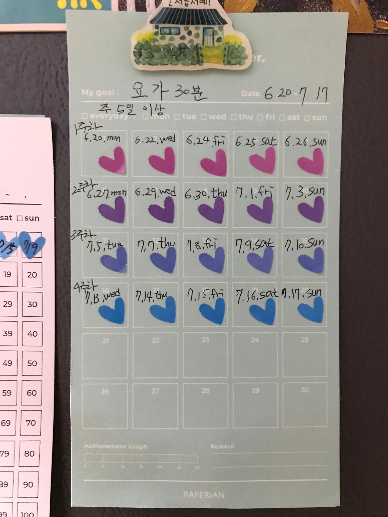 이에 힘 입어 그동안 미루기만 해왔던 요가 수련(아사나)을 시작할 수 있었다. 이번에는 30분간 주 5일 요가 수련을 4주간 하는 것으로 목표를 설정했다. 명상 덕에 탄력을 받아서인지 이 목표도 쉽게 달성했다.