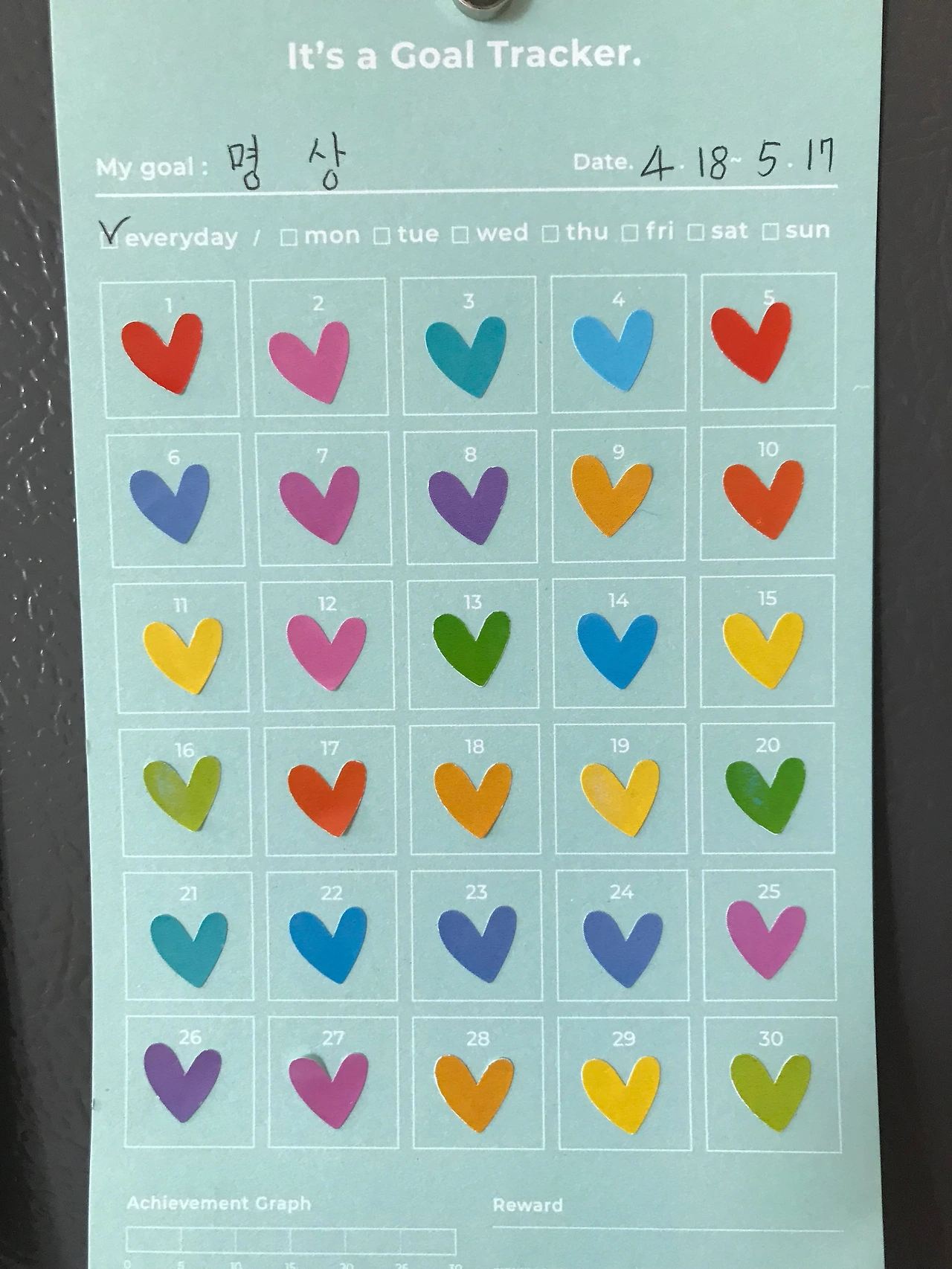 이 책에서 추천하는 하루 10분 명상의 가이드를 따라 한 달간 하루 10분 명상을 해보기로 다짐했다. 30일간의 일정을 표시할 수 있는 표가 인쇄된 종이에 그날 10분 명상을 완료할 때마다 스티커를 하나씩 붙여 나갔다. 아무리 무기력해진 나였지만 하루 10분 정도는 할 수 있을 것 같았다. 결국 30일간의 일정을 완료했다. 하루 10분을 지키지 못할 때도 있었는데 그때는 다른 날에 아침과 저녁 하루 두 번 명상을 했다.