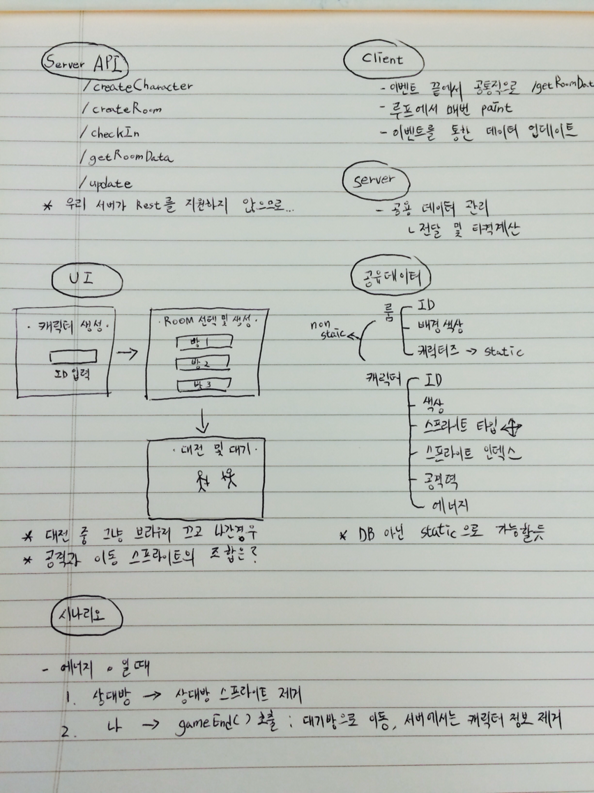 하지만 이것만으로는 당장 개발을 하기에 막막한 감이 있습니다. 시간이 흘러 머리 속으로 떠오르는 것을 아래와 같이 메모해 두었습니다. 컴퓨터에 문서로 깔끔하게 정리하는 것도 좋지만 가끔은 직접 손으로 써내려 가는 것이 더 자유롭게 표현할 수 있습니다.