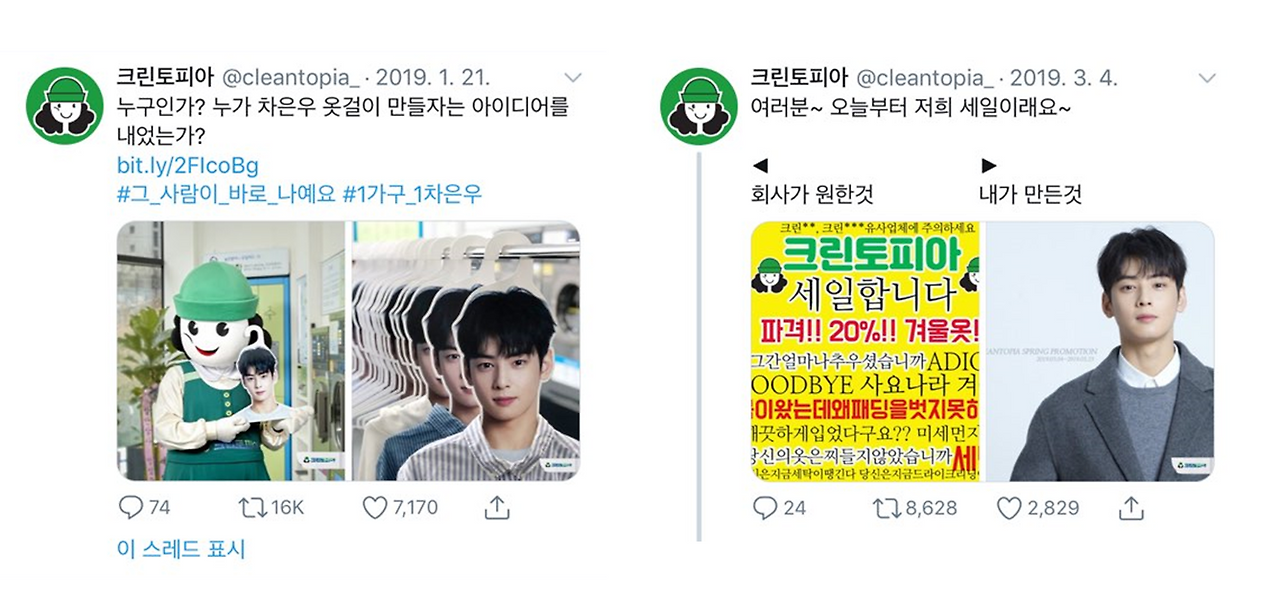 브랜드의 SNS 계정도 사람 냄새가 물씬 나게끔 운영하는 경우가 있다. 오래된 사례지만 한국 민속촌의 페이스북 계정이 그렇다. 그들은 조선 시대에 살았을 법한 아씨라는 가상의 캐릭터를 계정의 운영자로 설정해 예스러운 말투로 민속촌의 이야기를 전하는데, 그 말투와 프로필 사진에서 과거로부터 초대를 받은 것 같은 느낌이 살짝 묻어난다. 크린토피아 트위터 계정에는 잘생긴 연예인을 좋아하는 덕후의 유쾌함이 잔뜩 배어 있다. 그녀는 차은우의 잘생긴 얼굴로 옷걸이를 만든 다음, ‘이거 만든 사람이 나야 나’라며 유쾌한 자랑을 늘어놓고, 각종 행사 내용이 빼곡히 적힌 포스터 시안과 차은우의 잘생긴 외모가 중심이 되고 크린토피아 로고는 한쪽 구석에 작게 표시한 포스터를 함께 올리면서 앞에는 회사가 원한 거, 뒤에는 내가 원한 거라는 귀여운 멘션을 적어 놓는다. 계정에는 덕업일치를 이룬 어떤 이의 행복감이 그대로 묻어난다.