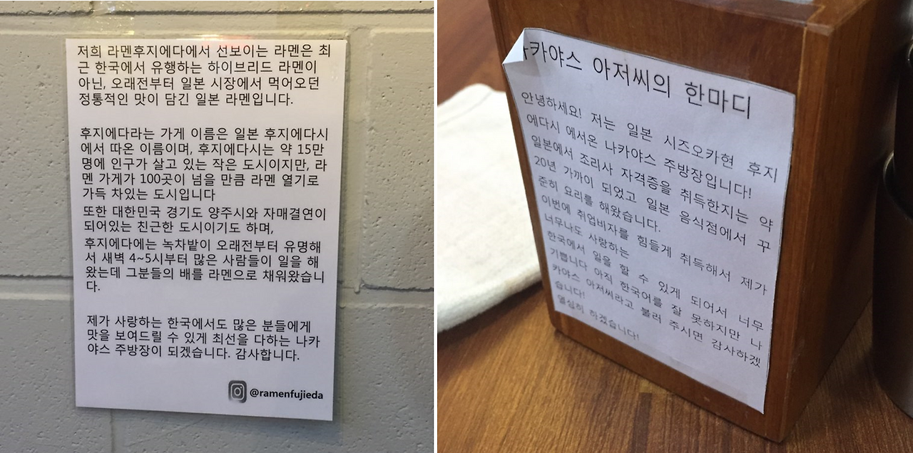 보통의 라멘집이라면 가게 앞에 정통이나 현지의 맛 같은 수식어가 붙어 있었겠지만, 이곳은 하얀 A4 용지에 편지처럼 빼곡하게 쓰인 글씨가 그 자리를 대신하고 있었다. 나는 투박하면서도 인간적인 글귀가 마음에 들어 안에 들어가 라멘 한 그릇을 먹었다. 그곳에서 먹은 라멘이 인생 라멘이고 영화처럼 따뜻한 경험을 했다면 아주 좋은 결말이었겠지만, 솔직히 맛은 특별하지 않았고 고객 응대도 평범했다. 그래도 한쪽 벽면과 젓가락 통에 자신과 자신이 살던 지역을 소개하고 자신이 만드는 라멘의 스타일을 꾸밈없이 적어 놓은 편지글 형식의 안내문은 인상적이었다.
