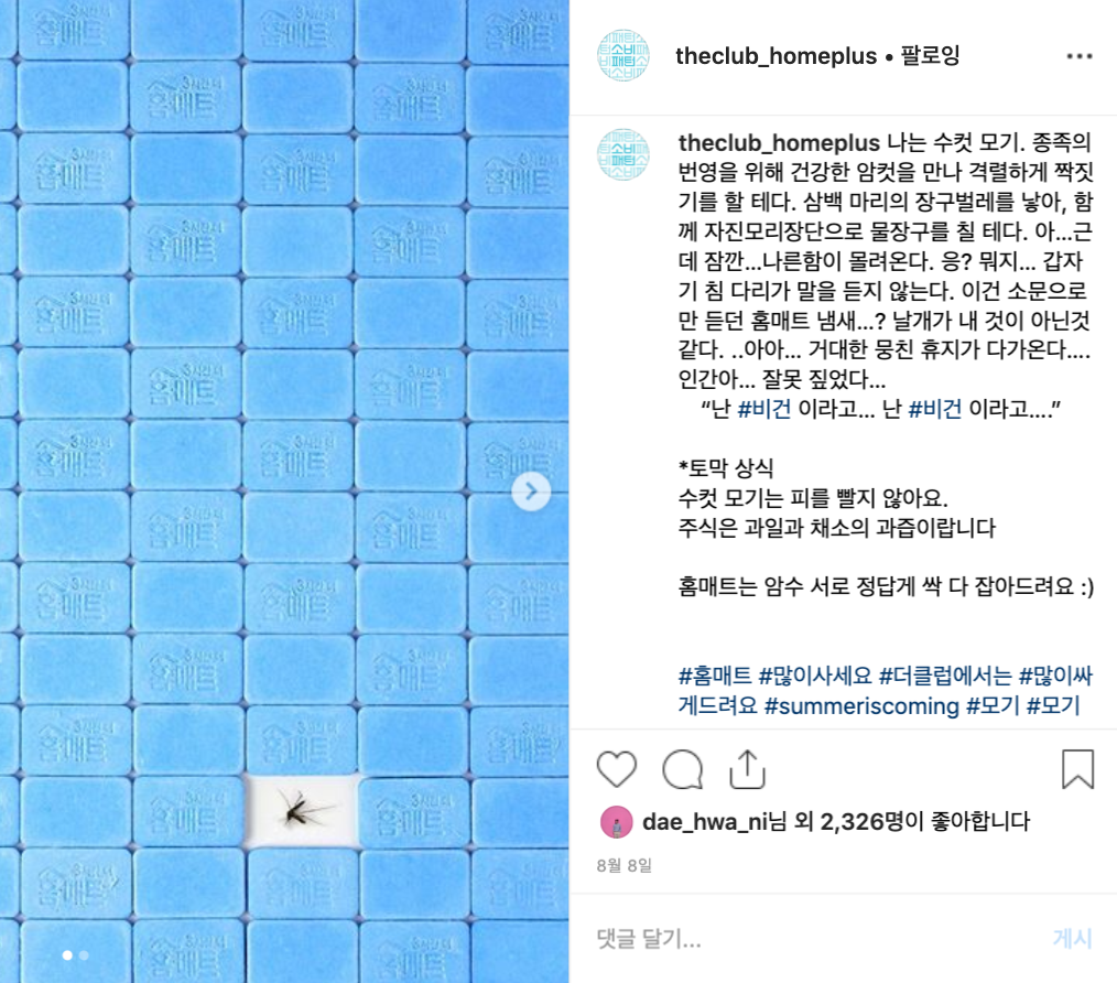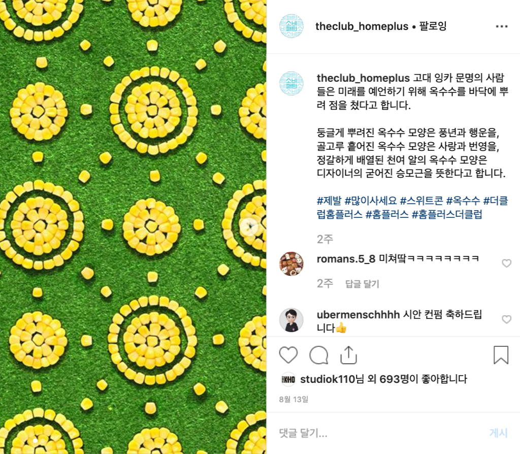 인스타그램에서 긴 텍스트의 포스팅은 확실히 허들이 됩니다. 화려한 이미지와 영상들 사이에서 관심을 끌어야 하고, '더 보기'를 눌러 전체 글을 확인해야 하니까요. 하지만, 글을 '엄청 잘' 쓸 수 있다면, 또 모를 일이죠. 저는 이제 홈플러스 더클럽 계정의 '다음 이미지가 뭘까?'가 아니라, '다음 글은 뭘까?'를 기대하고 있습니다.