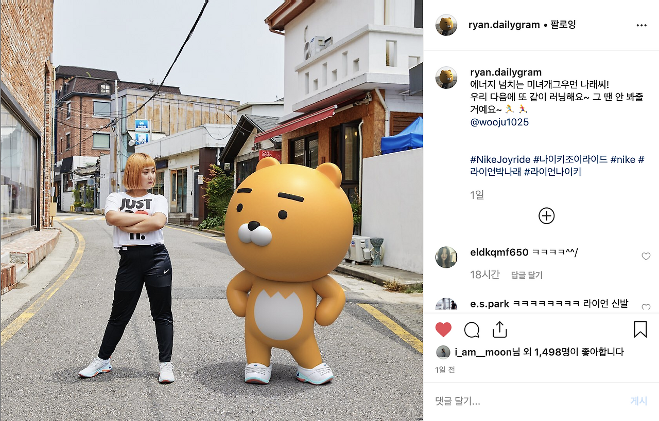 최근 라이언이 나이키와 협업한 '나이키 조이라이드' 콘텐츠에서는 라이언은 박나래를, 박나래는 라이언을 서로 태그하며 언급하고 있습니다. 더 이상 캐릭터 콜라보의 대상 정도가 아닌, 모델이자 셀럽으로서의 존재감을 당당하게 드러내고 있어요.