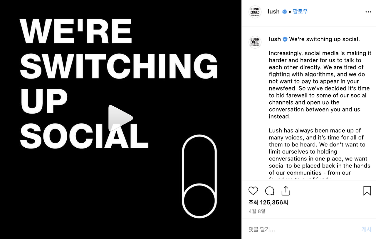 영국에서 시작해 세계적인 수제 화장품 브랜드가 된 러쉬가 올 4월 모든 소셜미디어 채널 운영을 중단하겠다고 선언 했습니다.