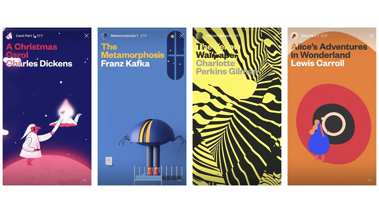 뉴욕 공립 도서관은 인스타그램에서 Insta Novel(인스타 소설) 캠페인을 진행했습니다. A Christmas Carol / Metamorphosis / The Yellow Wallpaper / Adventures in Wonderland 네 권의 소설을 인스타 스토리에 딱 맞는 UI & UX를 설계해 보여주는 콘텐츠인데요. 스토리 기능을 진짜 '스토리'를 전달하는 데 사용한 거죠.
