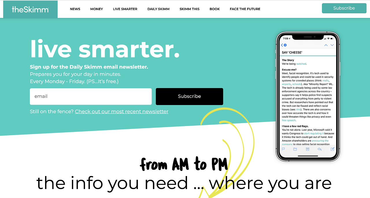 미국에서 가장 성공한 뉴스레터 서비스로 평가받는 '더 스킴'은 밀레니얼 세대, 특히 여성 독자들을 타깃으로 설정했습니다. 네이밍에서도 알 수 있듯 가볍게 훑여볼 수 있도록(Skim) 이슈가 되는 뉴스들을 캐주얼한 대화형 문법으로 가공했어요. 이러한 특유의 문법은 뉴스를 어려워하던 젊은 여성 타깃들의 폭발적인 반응을 이끌어내며 700만 구독자를 달성합니다. (2018년 기준) 이는 당시 뉴욕타임즈 모닝브리핑을 구독하는 독자의 4배를 넘는 숫자였다고 하네요.