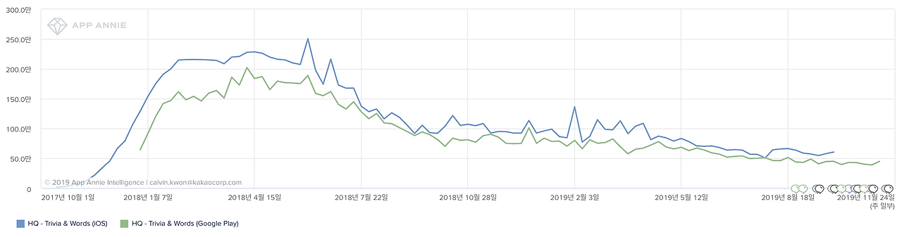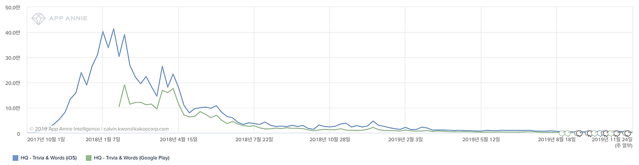 사실 국내에만 국한되는 얘기는 아닙니다. 2017년에 미국에서 론칭한 라이브 퀴즈쇼의 원조 HQ Trivia 또한 인기가 빠르게 시들해졌어요. 아래의 앱애니 지표를 보면 무슨 '작전주'의 그래프를 보는 것 같죠. 바로 바통을 이어받은 중국의 경우도 2018년 초반의 퀴즈 앱 붐 이후로 관련된 후속 기사는 찾아볼 수 없었어요.