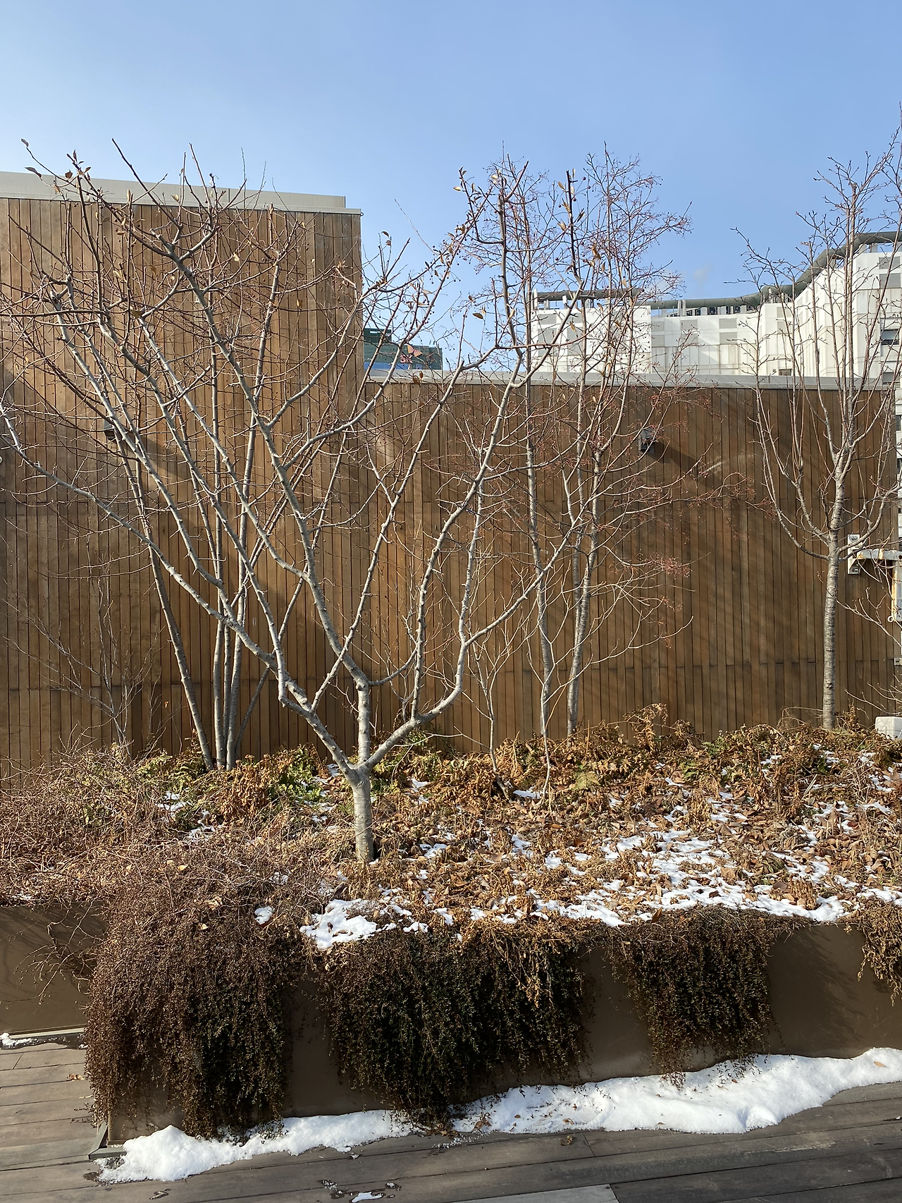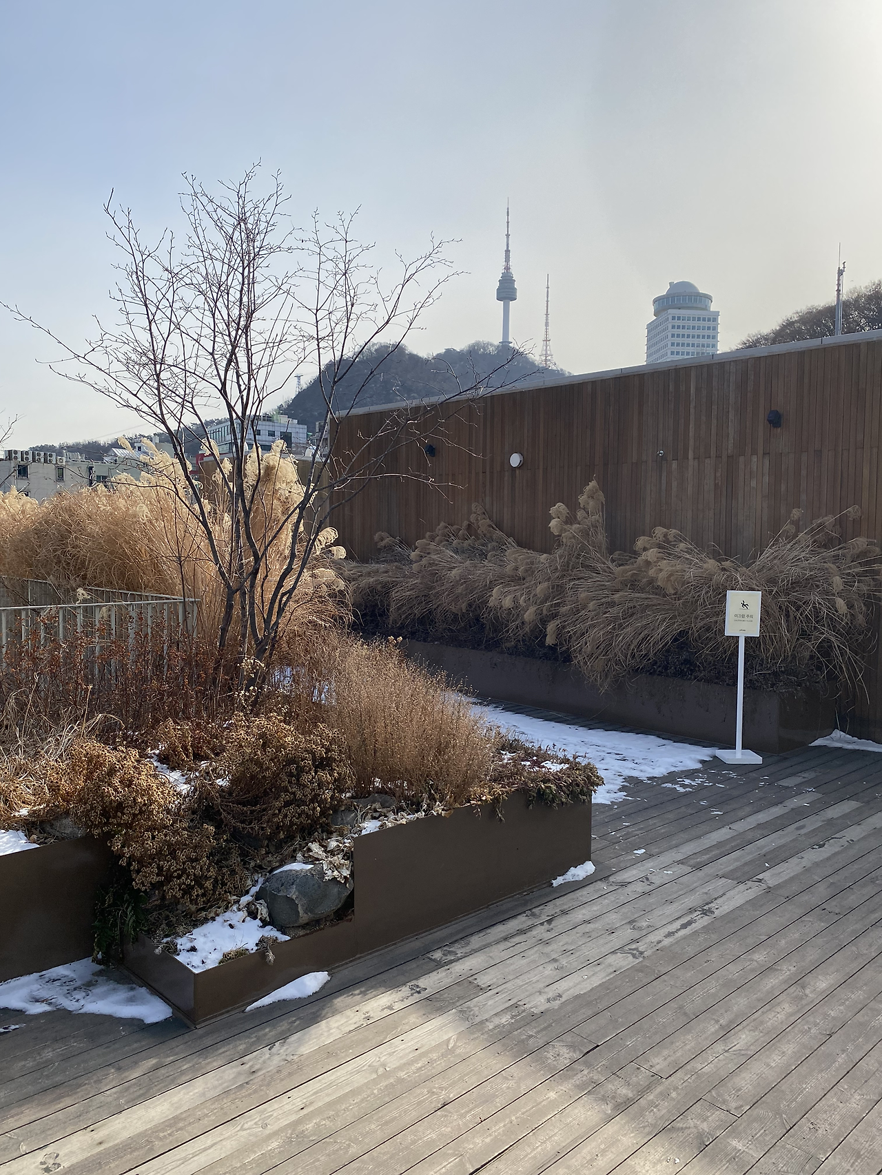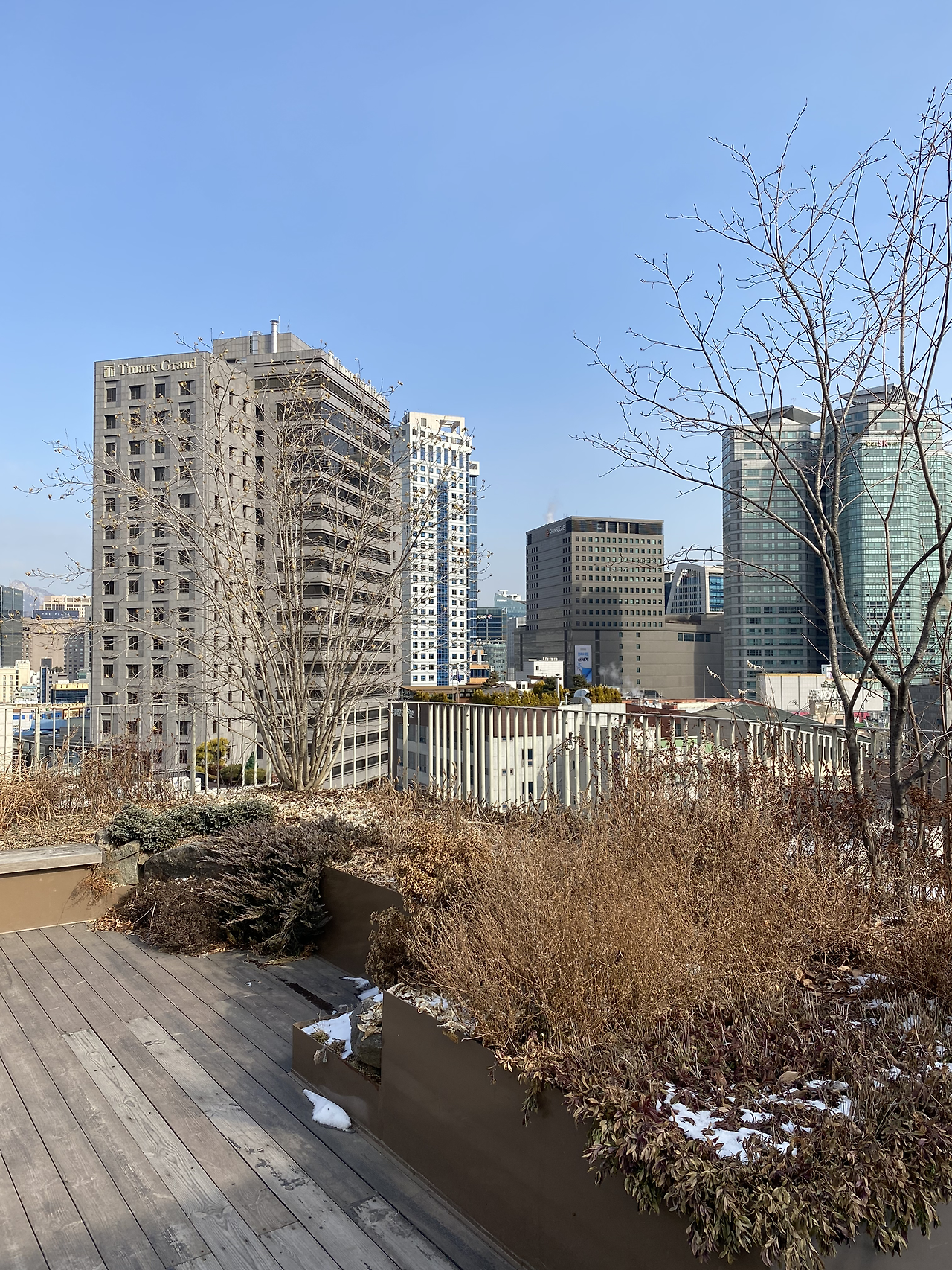 어렴풋한 기억에 이곳은 조경계의 대모이신 정영선 님의 작품으로 알고 있다.(참고로 1층엔 정원사 김봉찬 님의 정원작품이 있다.) 싸늘하게 생명력을 잃은 식물들의 고즈넉한 모습에 서울의 풍경이 겹쳐지니 꾀나 근사한 풍경을 자아낸다.
