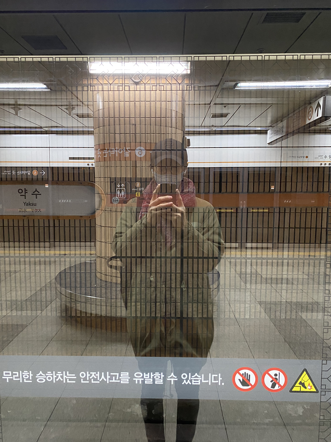 평일이면 북적될시간이지만 추운 겨울 주말 아침은 꾀나 기분 좋게 한산하다. 용기를 내어 평소라면 엄두도 못 낼 지하철 플랫폼 앞 셀카를 찍는 여유도 가져본다.