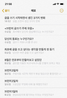 근데 글쓰기를 시작하고 나서는 메모 습관이 조금씩 바뀌기 시작했다. 다른 일을 하다가도 갑자기 쓰고 싶은 주제, 문장, 단어가 머릿속에 떠오르면 똑같이 메모를 하긴 하되, 나중에 이걸 왜 썼는지 기억하기 쉽게 항목 별로 정리하여 메모를 하고 있었다.