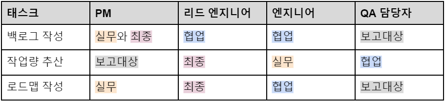 예를 들어 '백로그'는 PM이 엔지니어들과 협업해 작성(실무)하여 QA 담당자에게 알려줍니다(보고). 최종 책임자는 PM입니다. 그리고 '작업량'은 엔지니어들이 QA 담당자와 협업해 추산(실무)하여 PM에게 보고합니다. 최종 책임은 리드 엔지니어가 집니다.